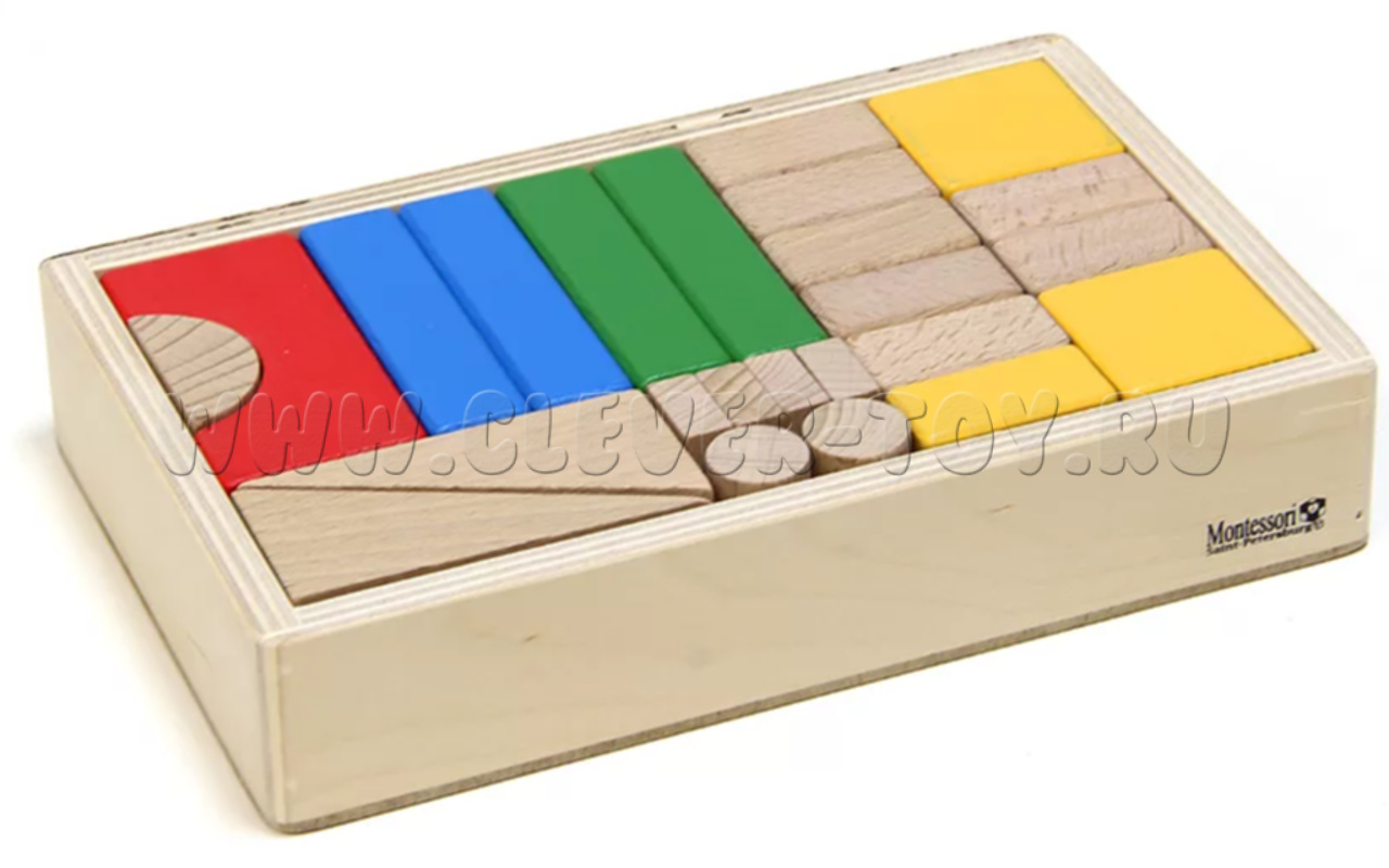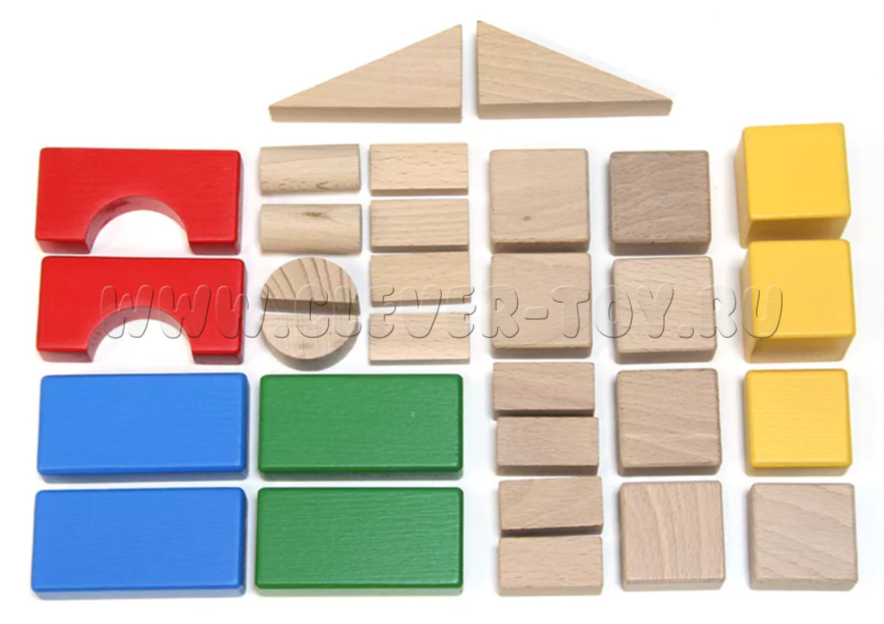 В наборе 30 элементов конструктора, которые выполнены из цельного бука и окрашены безопасными для здоровья красками на водной основе. Они не вызывают аллергию и не имеют неприятного запаха. Некоторые элементы конструктора оставлены в натуральном виде.