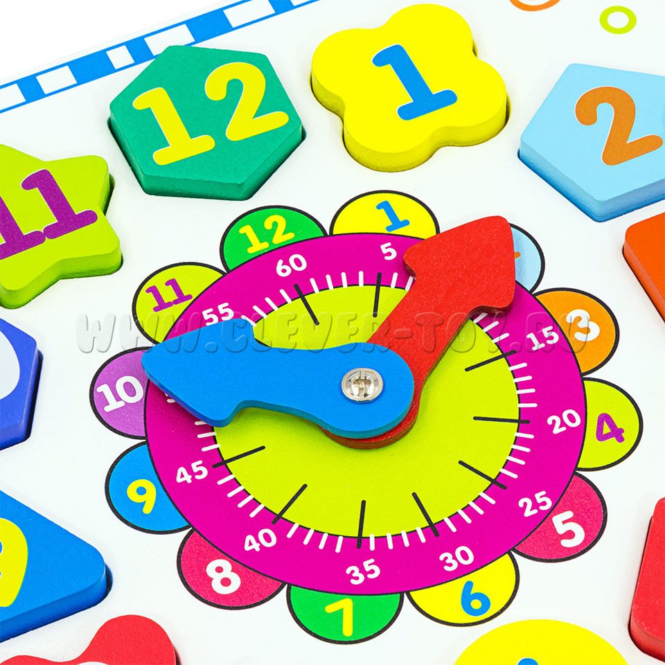 Фигуры расположены вокруг циферблата. С обозначением цифр от 1 до 12, разной формы и разных цветов. Поможет малышу познакомиться с геометрическими фигурами, развить логику, мелкую моторику.