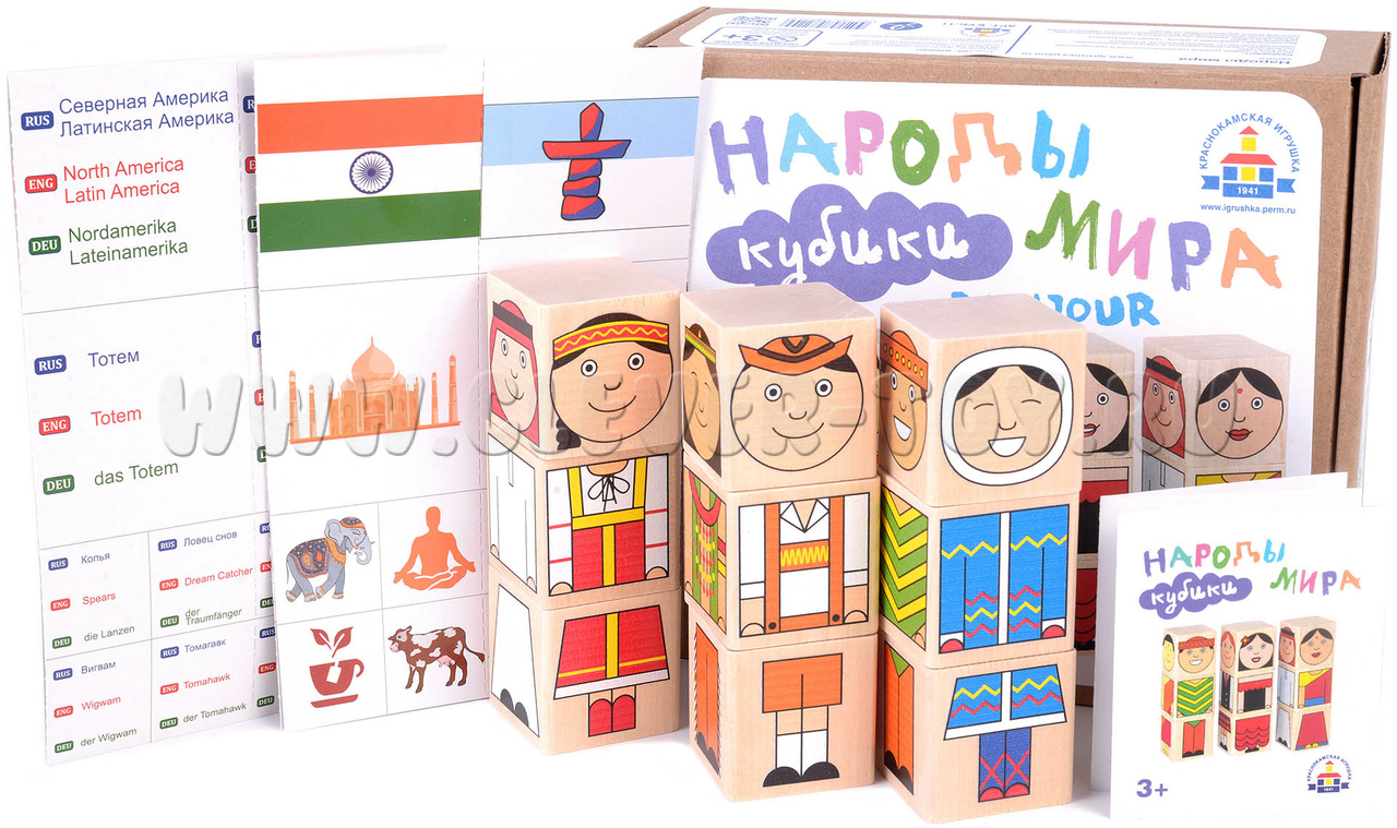 В комплект входит 9 деревянных кубиков. На 4-х гранях каждого кубика нанесена яркая картинка – часть тела забавных человечков разных национальностей. Картинки расположены таким образом, что можно ставить кубики друг на друга, чтобы получался вертикальный «кубический человечек».