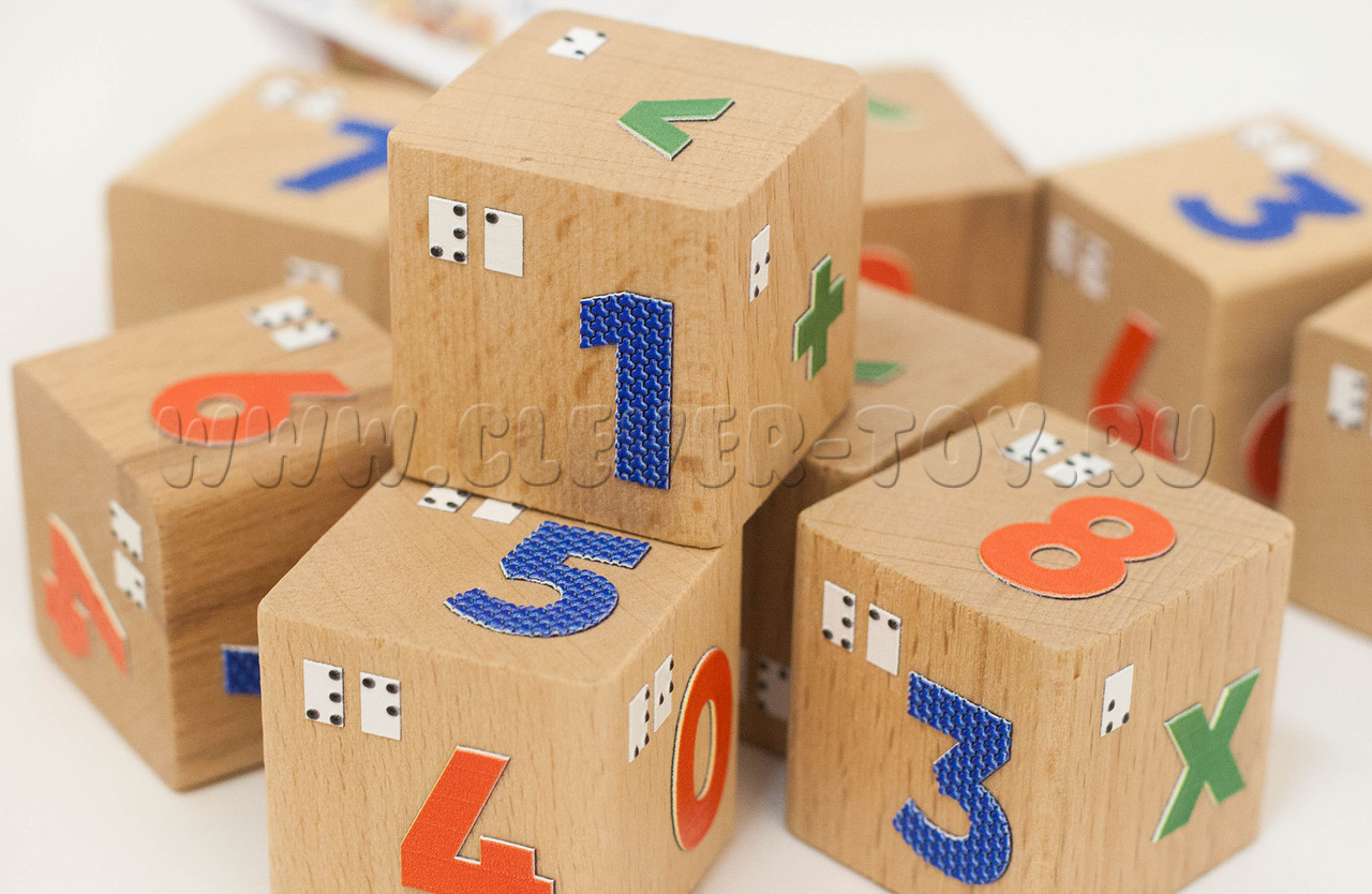 • на грани кубиков нанесены математические знаки: "плюс", "минус", "равно", "больше", "меньше", "умножение", "деление" и их обозначения шрифтом Брайля.