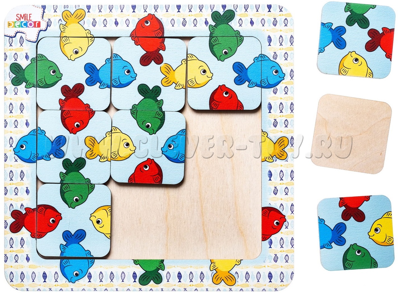 2. Игра "Собери рыбок". Достаньте несколько элементов головоломки из рамки-основания. Предложите ребенку вставить квадраты обратно в рамку так, чтобы половинки рыбок (голова и хвост) соответствовали друг другу по цвету.  Если ребенок легко справляется с заданием, то извлеките все элементы и попросите собрать рыбок в аквариуме.