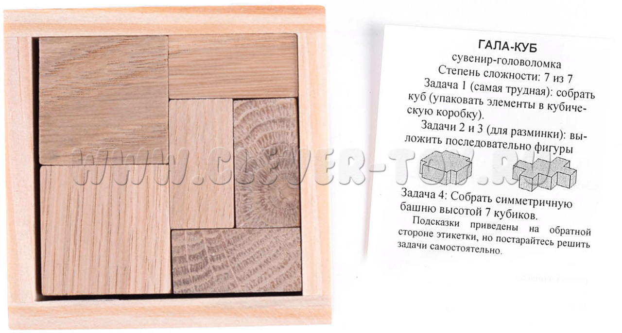 Гала куб состоит из 8 элементов и деревянной коробочки. Перед вами стоит две задачи. Сначала – упаковать все 8 элементов внутрь. А затем достать их выложить крест по толщине, равный ребру кубика.