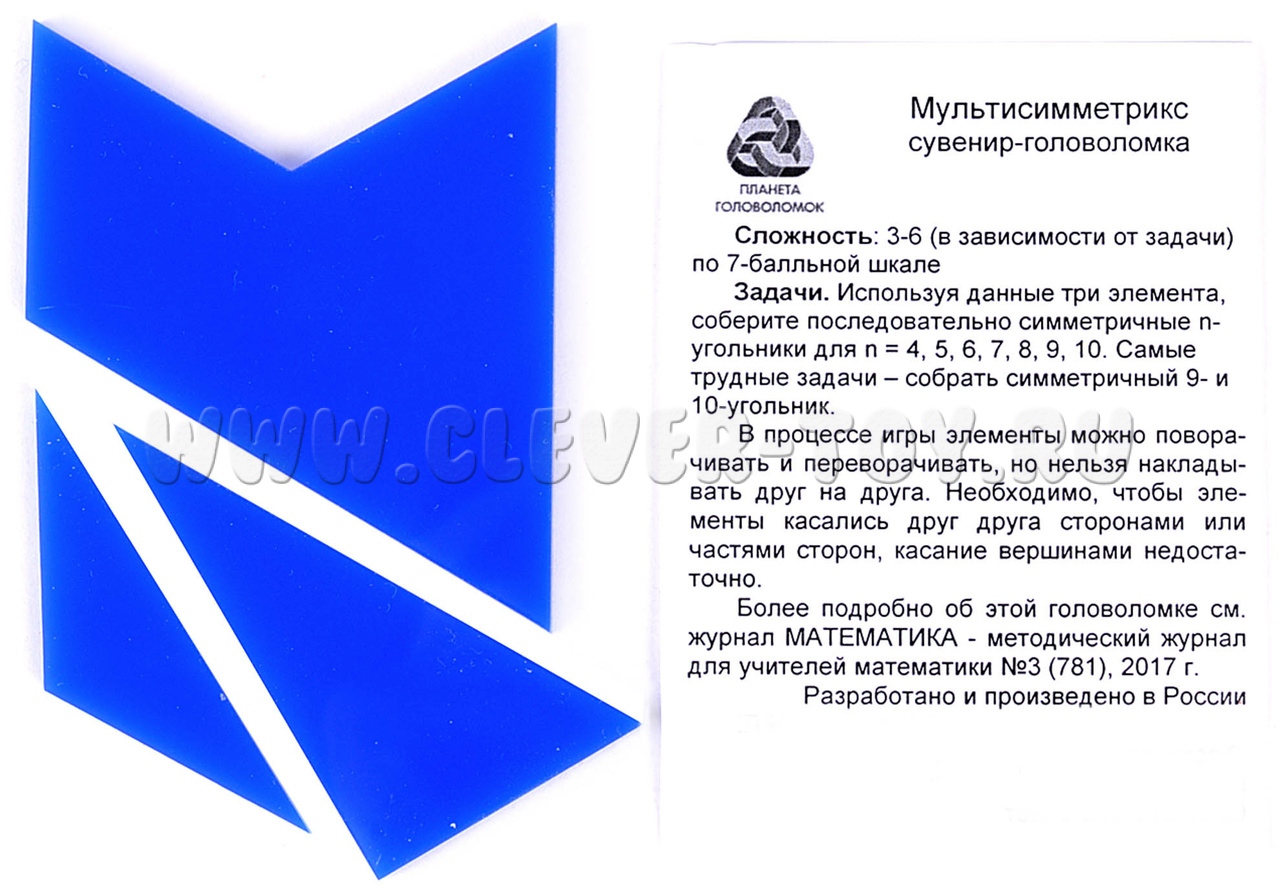 “Мультисимметрикс” – новая головоломка про углы и симметрию. Ваша задача – собирать фигуры, используя три элемента. Исходные детали должны касаться друга сторонами. Касание углов недостаточно.