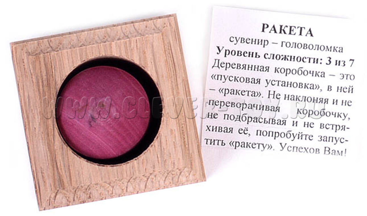 "Ракета" или "Достань ракету". Внешне головоломка выглядит как деревянная коробочка с нишей, в которой находится столбик в форме ракеты. Особенность головоломки заключается в том, что столбик гладкий на верхней части и его невозможно зацепить пальцами.