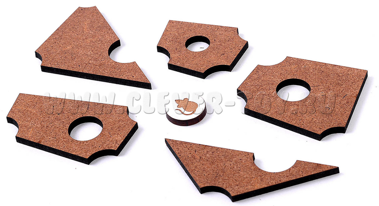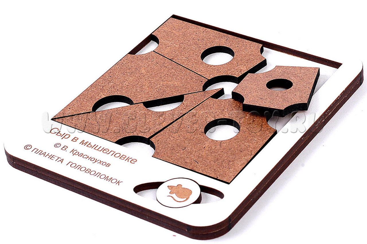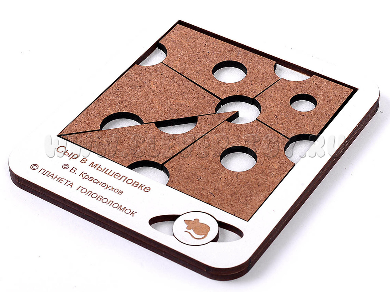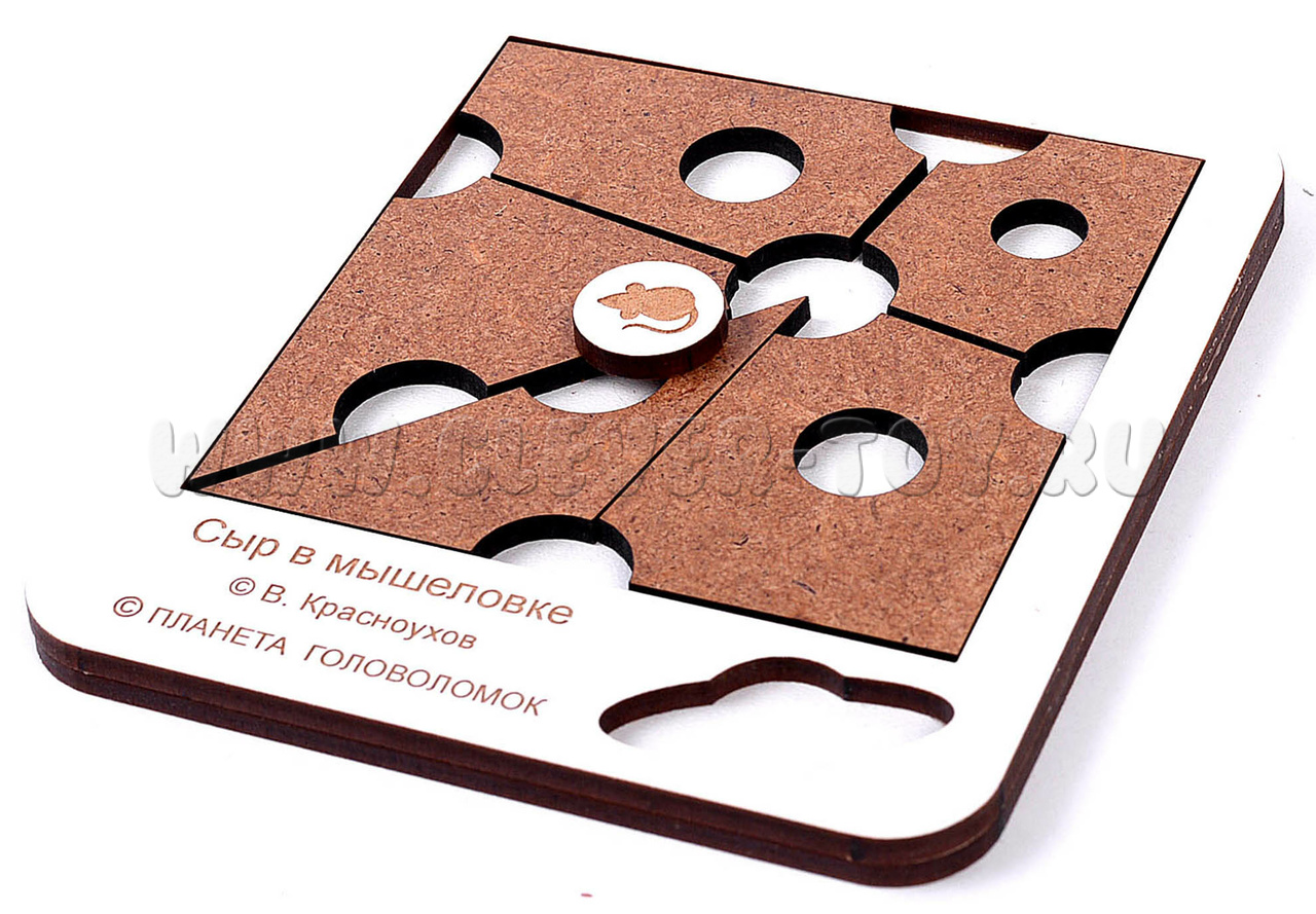 Головоломка "Сыр в мышеловке" представляет собой игру, в которой необходимо разместить все кусочки сыра и мышку внутри квадратной коробочки.