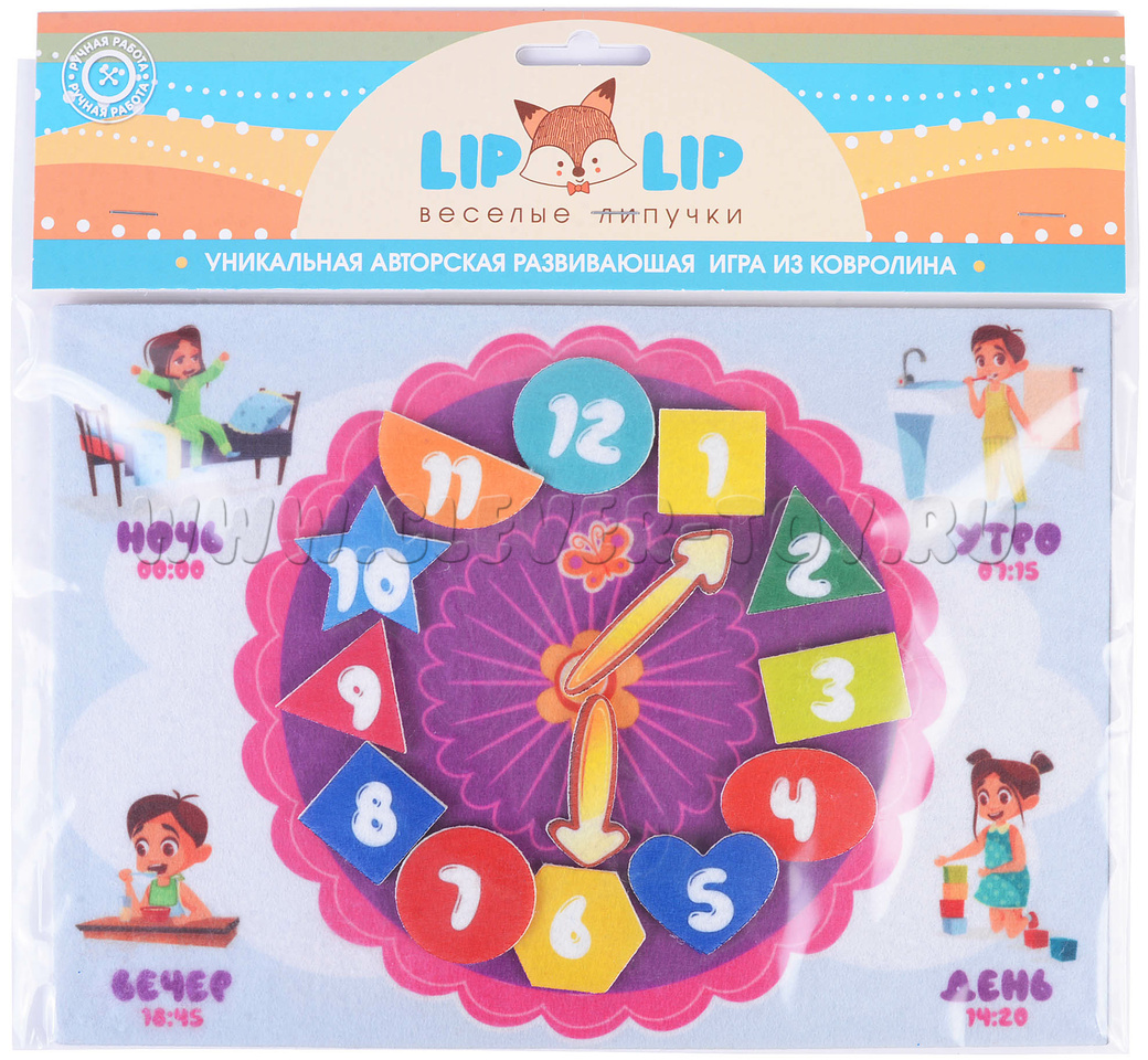 Во-вторых, каждый набор Веселых липучек посвящен определенной тематике. Этот – времени. Эта многоразовая аппликация поможет детям познакомиться с часами и временными промежутками.