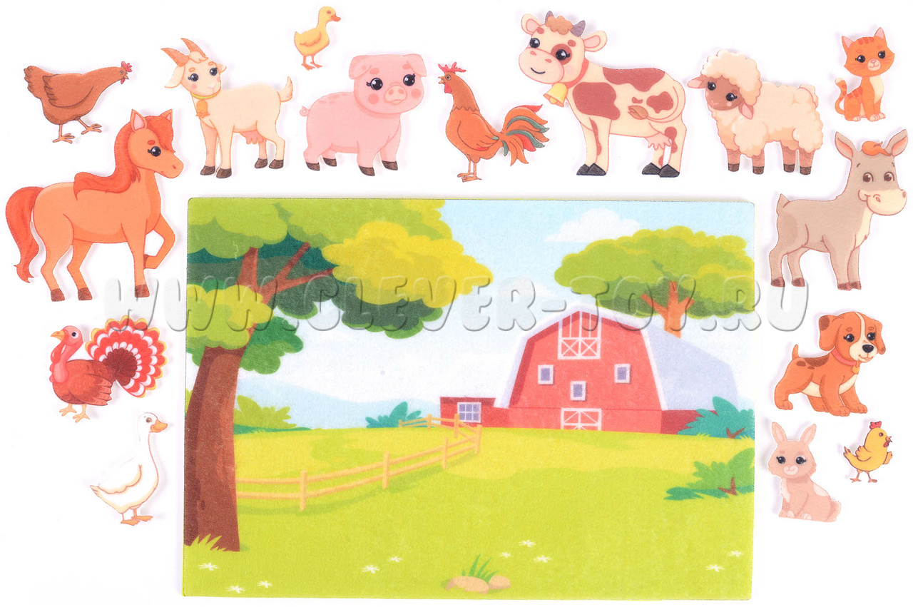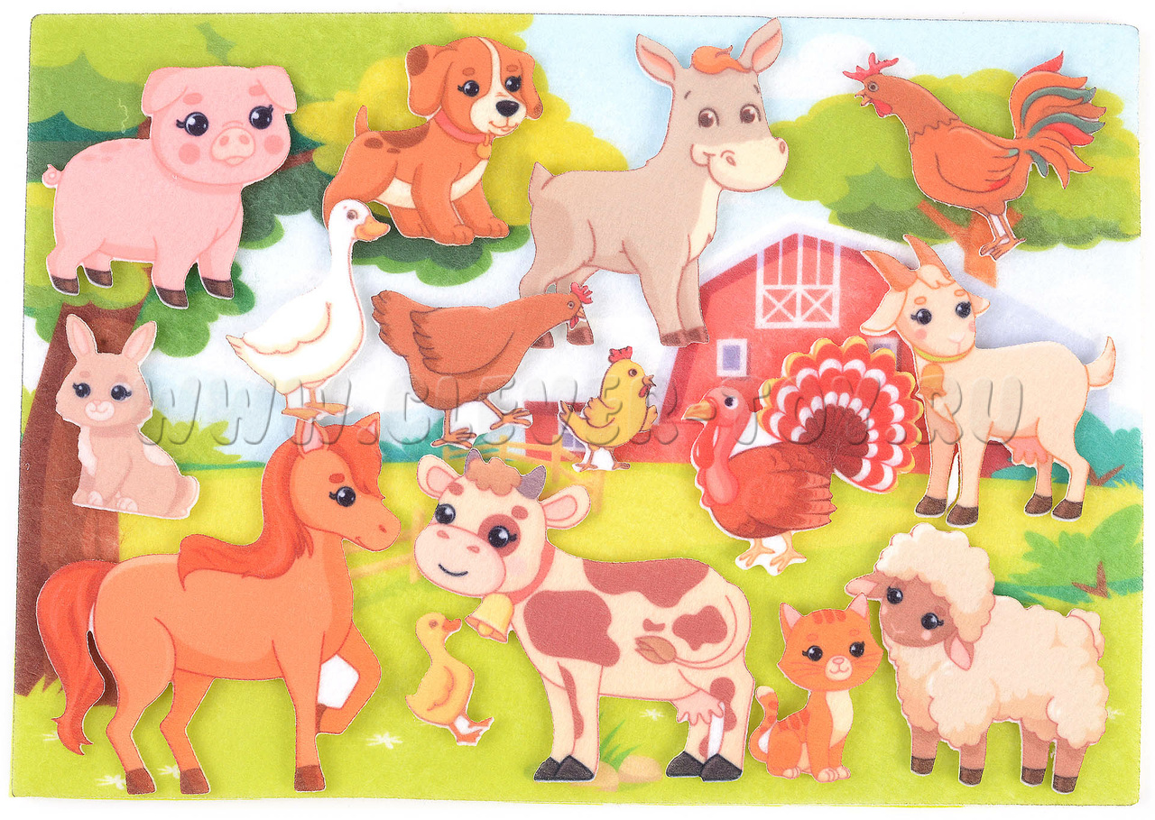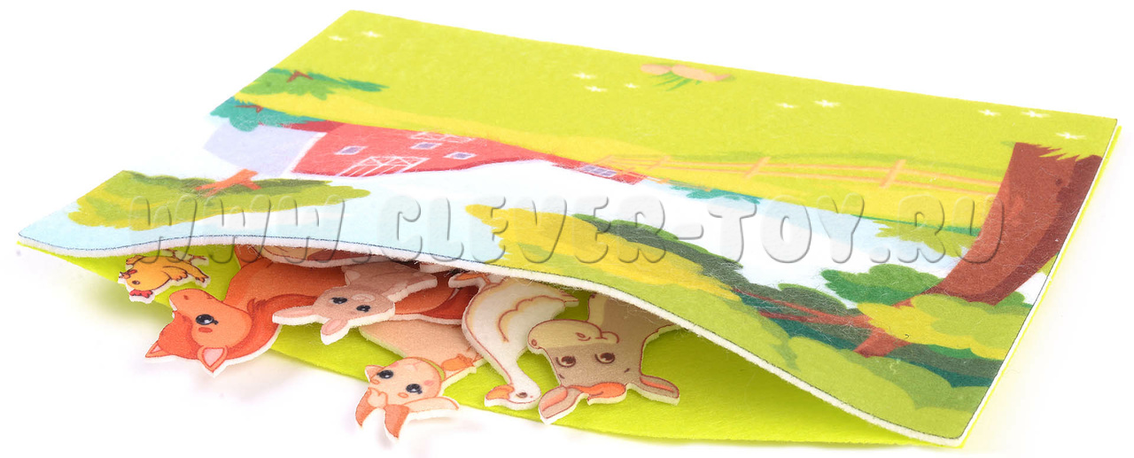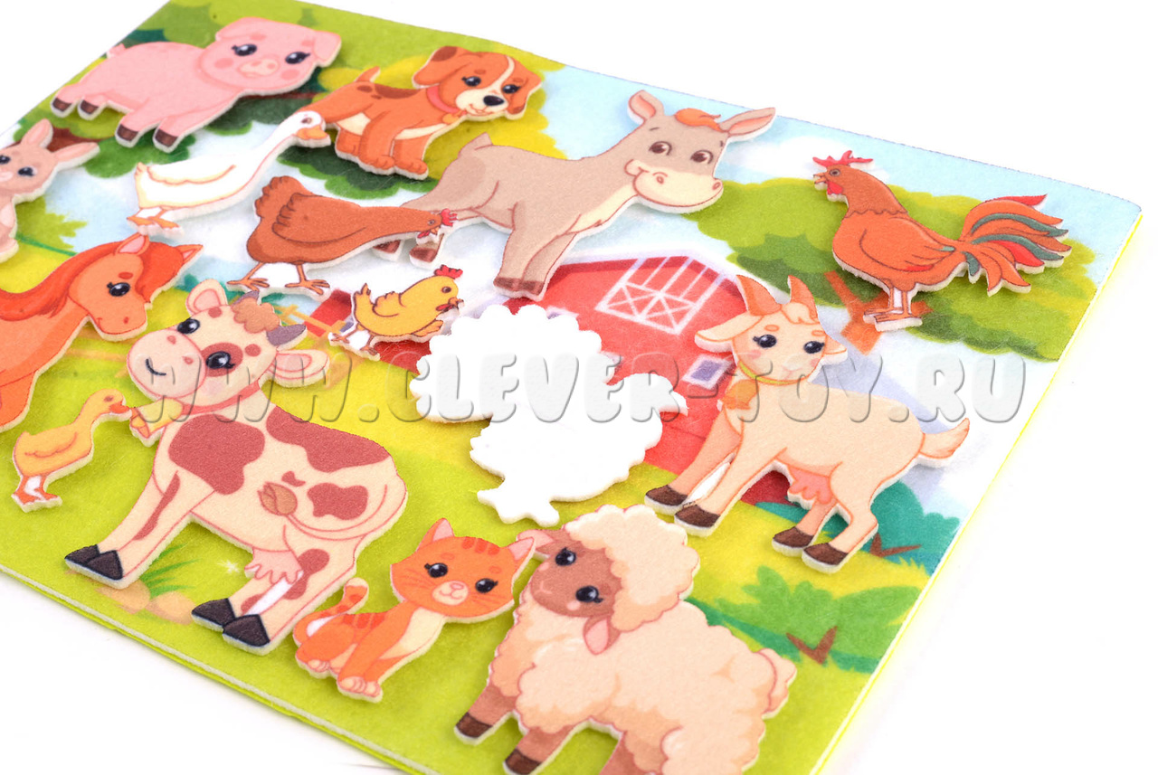 Перед глазами Вашего ребёнка раскинутся зелёные поля, холмы и луга, на которых весело и мирно гуляют самые разные домашние животные из мягкого фетра. Все фигруки животных находятся на липучках и легко крепятся к игровому полю.