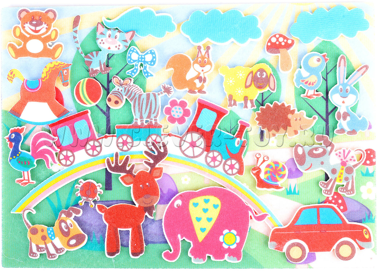 - грибок, тучки, цветочек, бантик, радуга с паровозиками, куда можно посадить зверей;