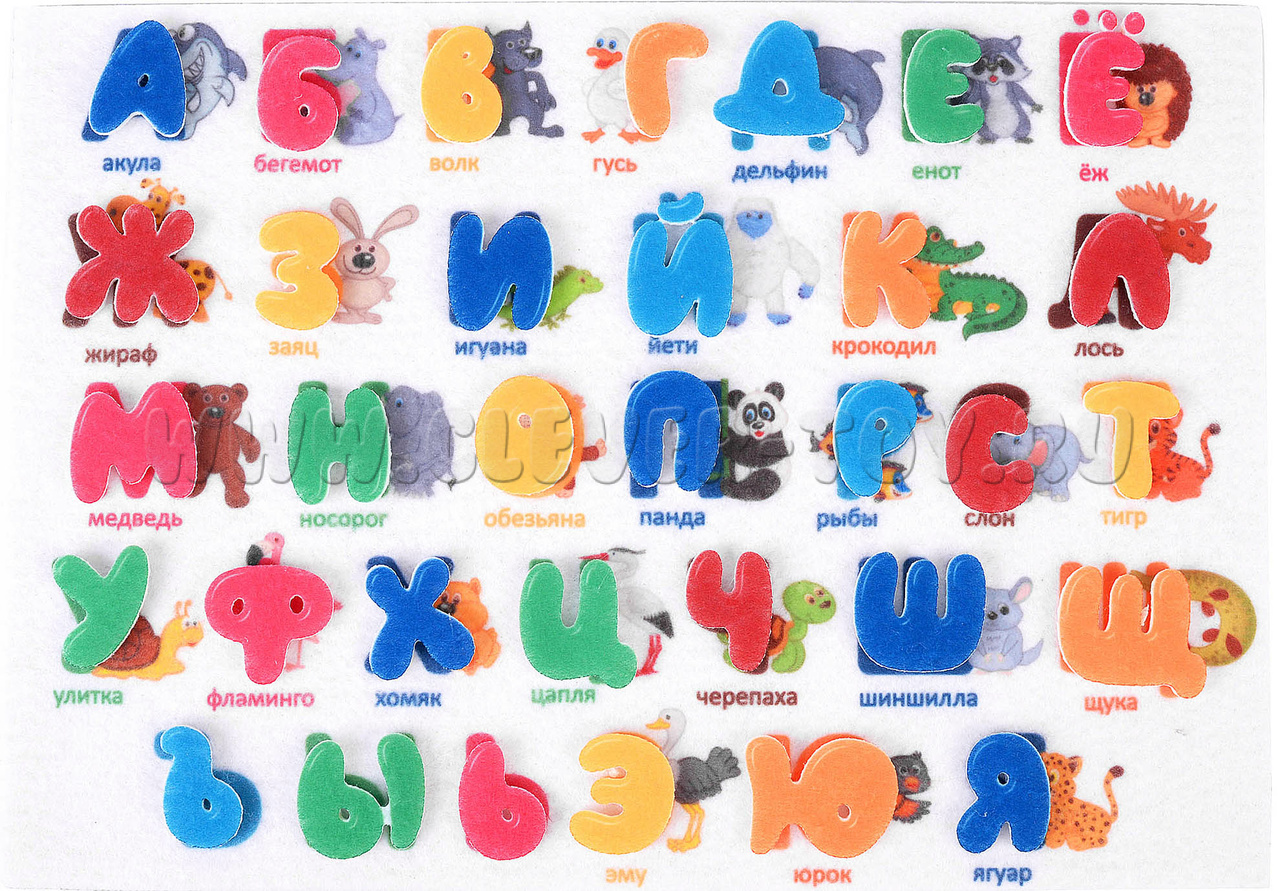 • 33 буквы на липучках синего, голубого, красного, зелёного, жёлтого и оранжевого цветов;