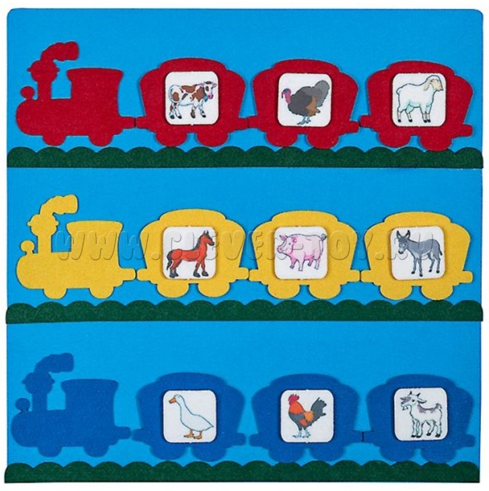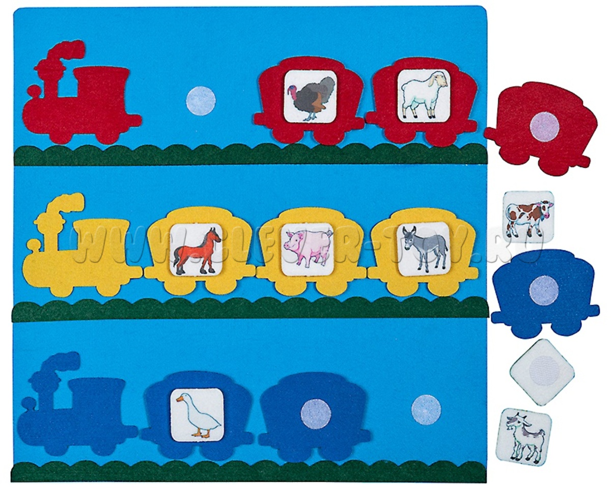 1. Рассмотрите вагончики и назовите животных, которые в них едут. Имитируйте звуки пассажиров ("Муу", "Иго-го", "Га-га" и т.д.