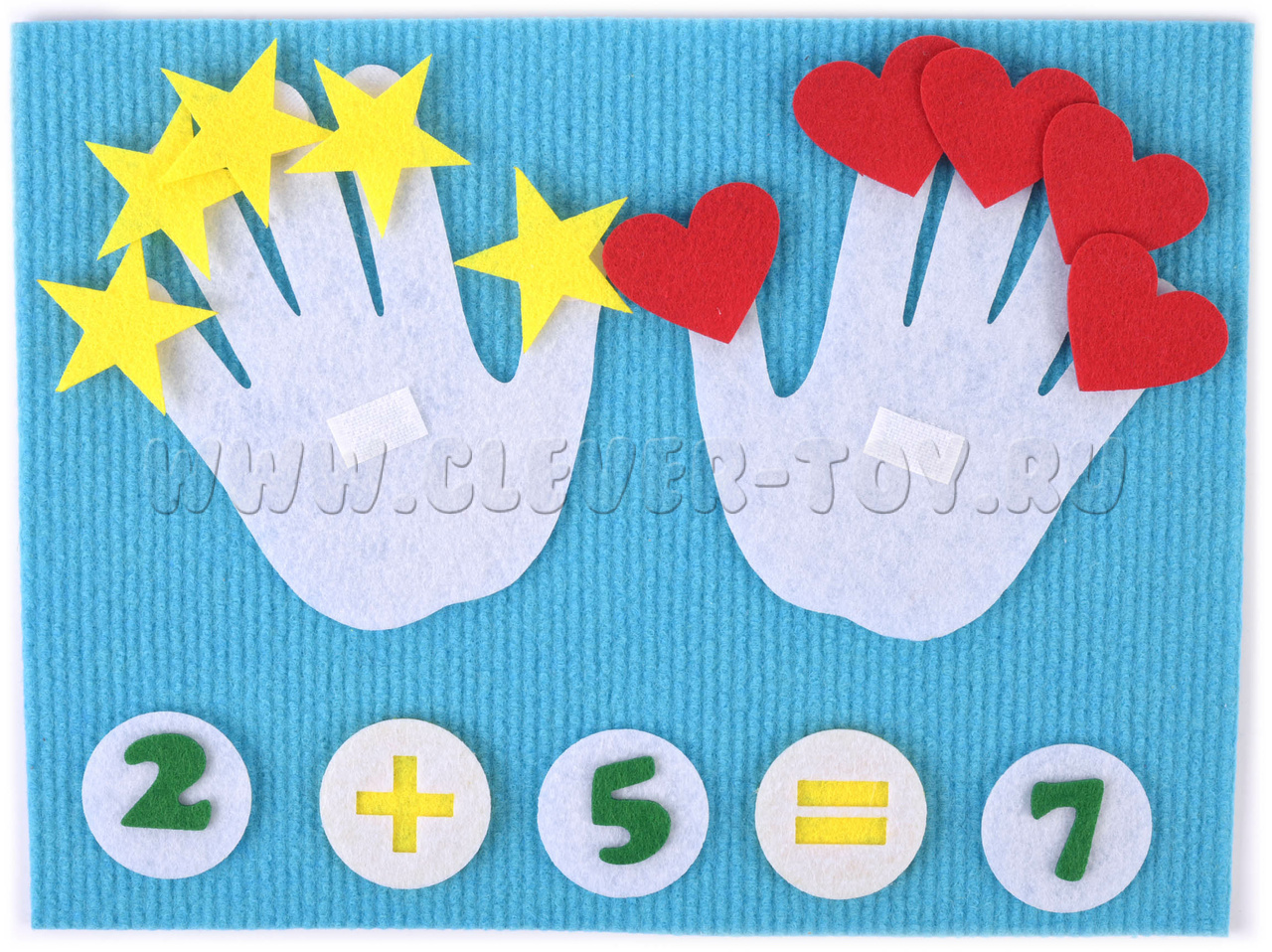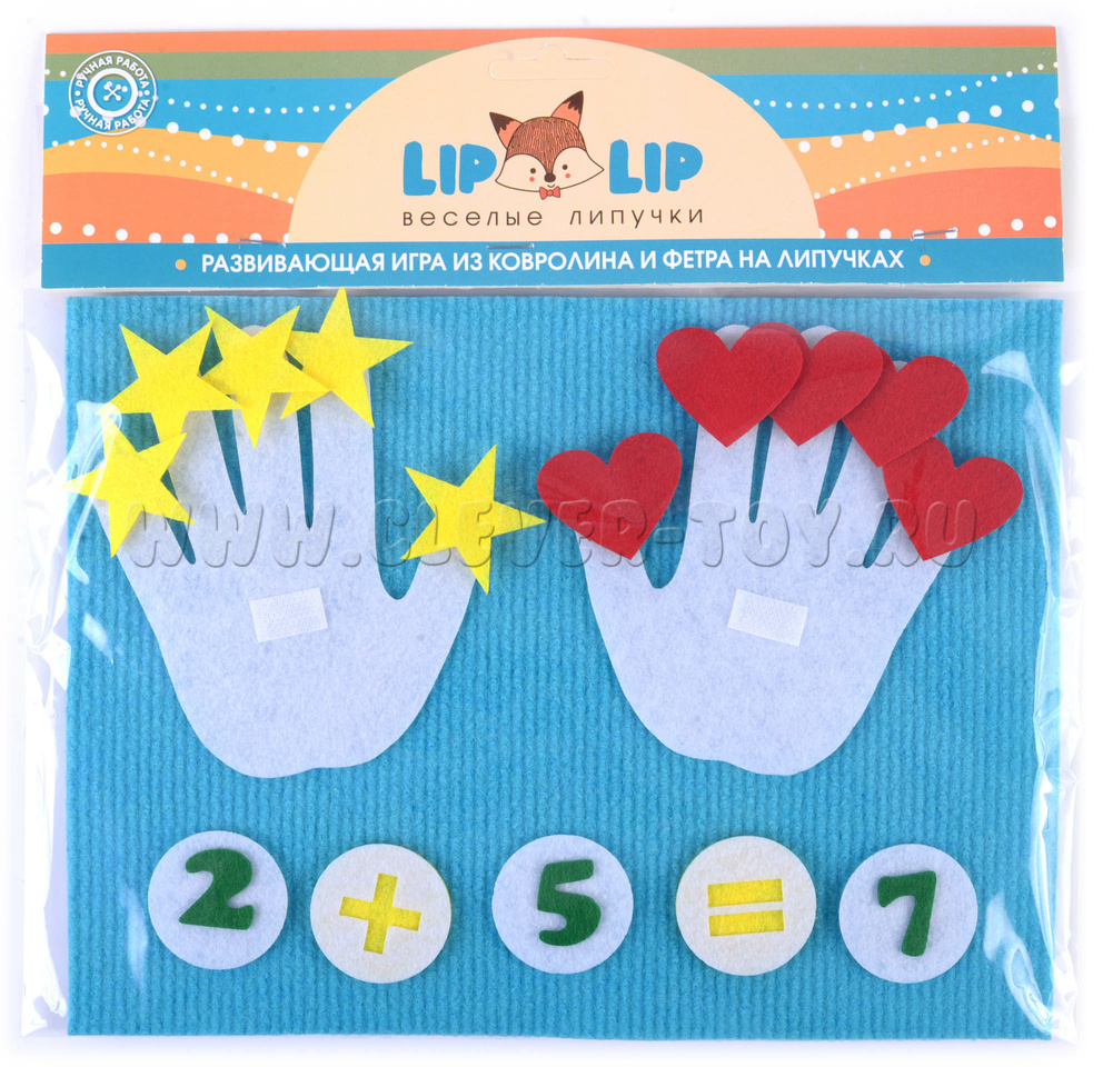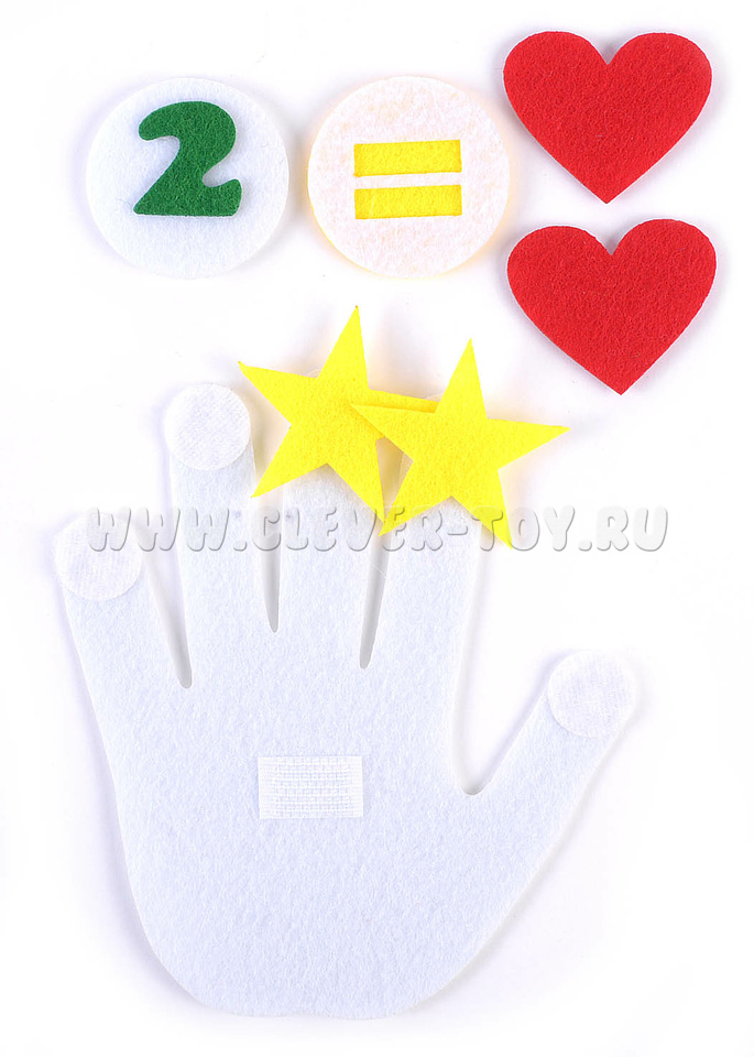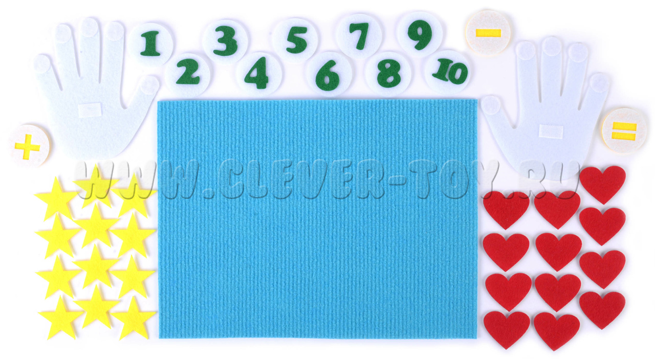 • Набор из 40 фигурок (ладошки с липучками на пальцах и ладонях, звездочки, сердечки, цифры, знаки),