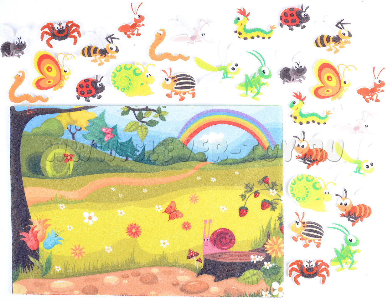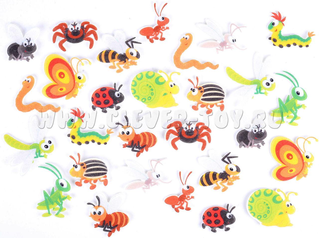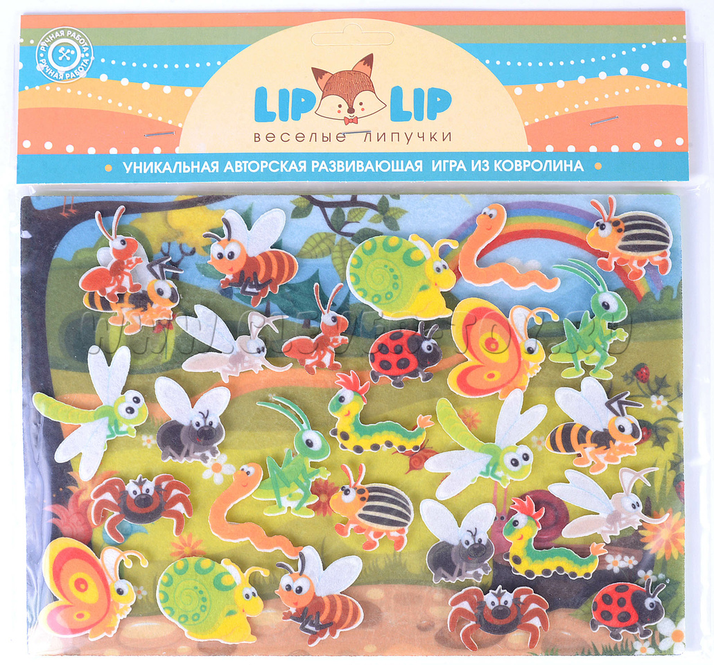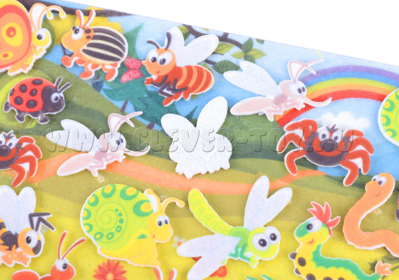 • 14 пар насекомых: кузнечики, мухи, пчёлы, червяки, комары, бабочки, улитки, гусеницы, муравьи, паучки, божья коровки, колорадские жуки, осы, - все они выполнены в мультипликационном стиле, весёлые и яркие, легко крепятся на игровое поле с помощью многоразовых липучек;