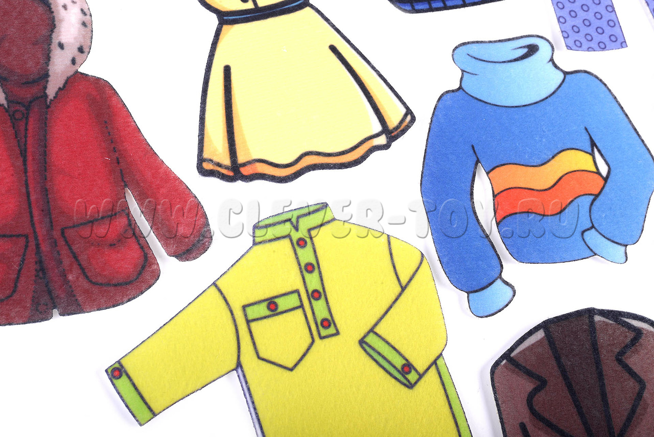 В комплекте 11 фигурок с изображениями одежды, на липучках.
