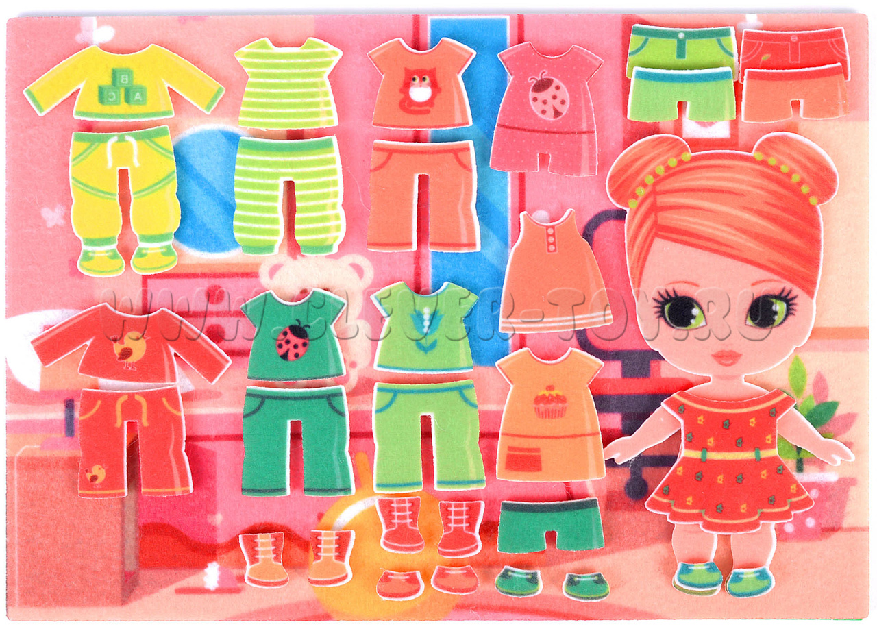 25 предметов одежды и обуви. Яркие, разноцветные, имеют многоразовые липучки и легко крепятся на фигурку девочки. Вся одежда прорисована до мельчайших деталей, включая украшения, картинки и шнурки на ботиночках.