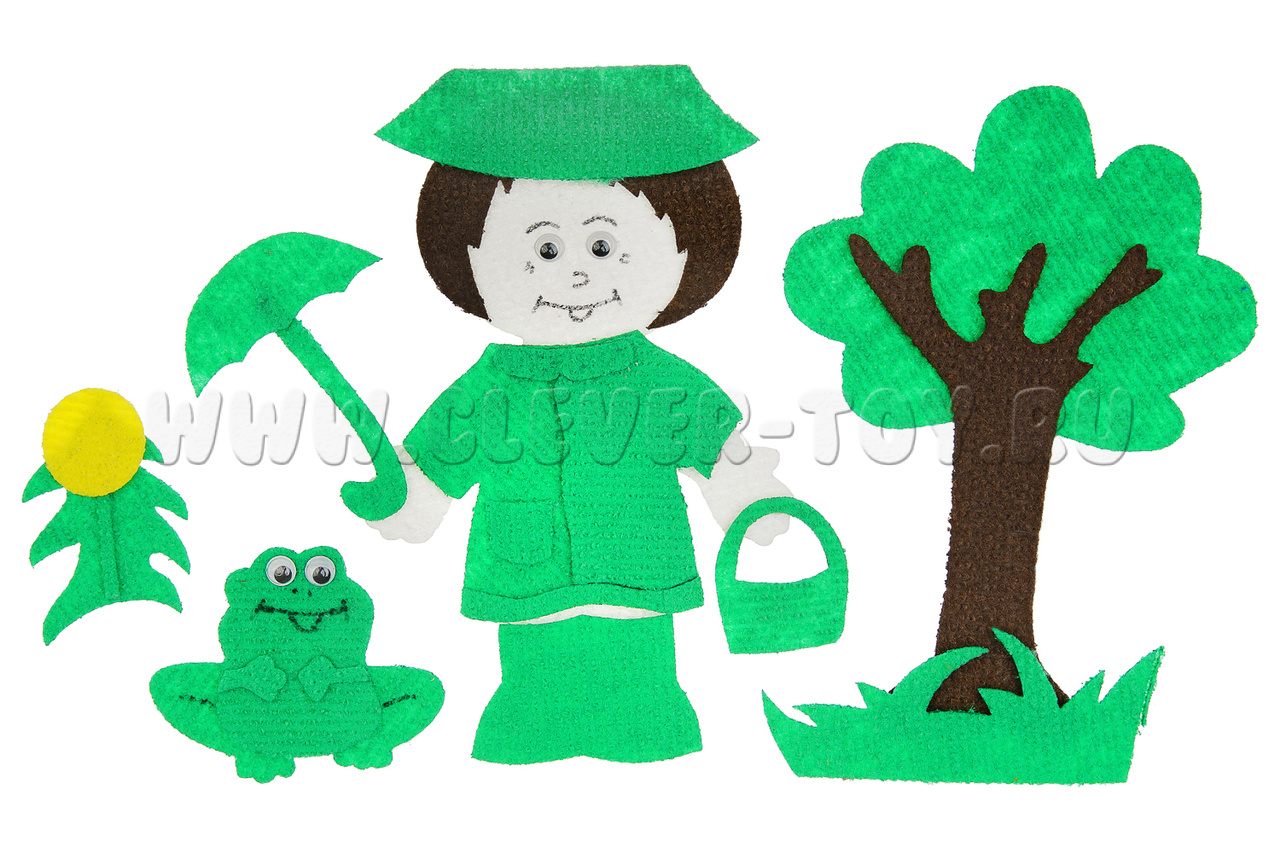 • одежда, аксессуары и атрибуты весны (зелёный): шапка, пальто, сапоги, корзинка, зонт, дерево, трава, лягушонок, цветок;