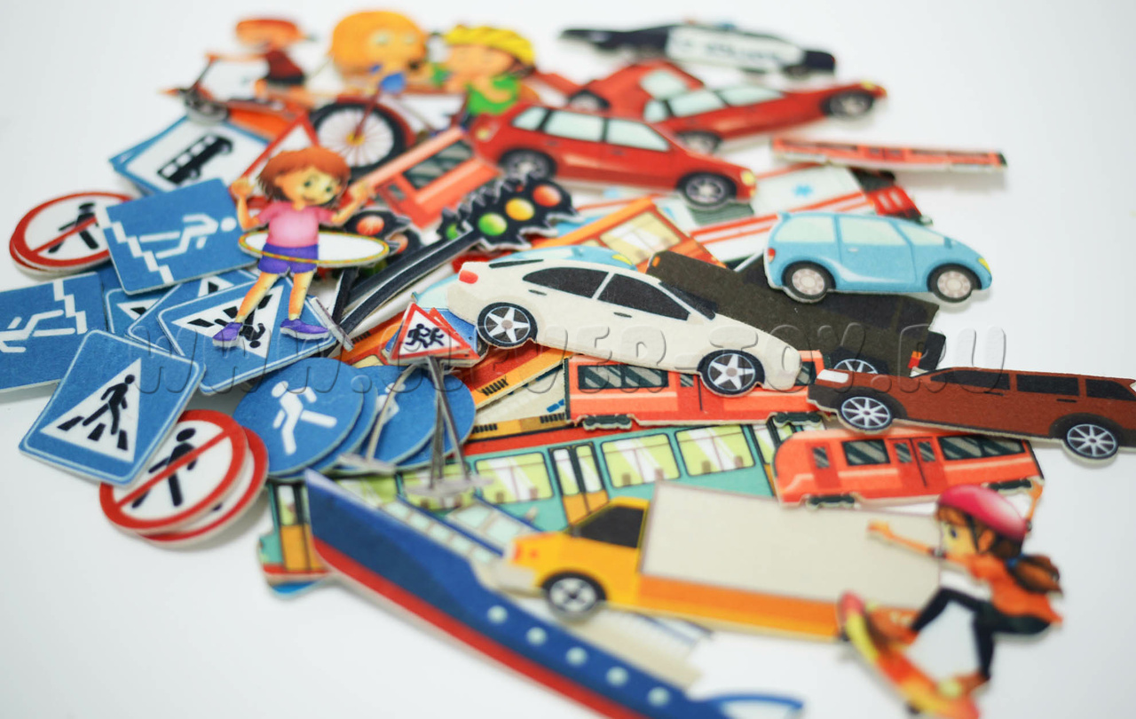 • 13 фигурок машинок и общественного транспорта: легковые и грузовые автомобили, поезд, троллейбус, полицейская машина, пожарная машина, скорая помощь, автобус; пароход и катер; более 20-ти дорожных знаков; 6 светофоров, 8 фигурок детей;