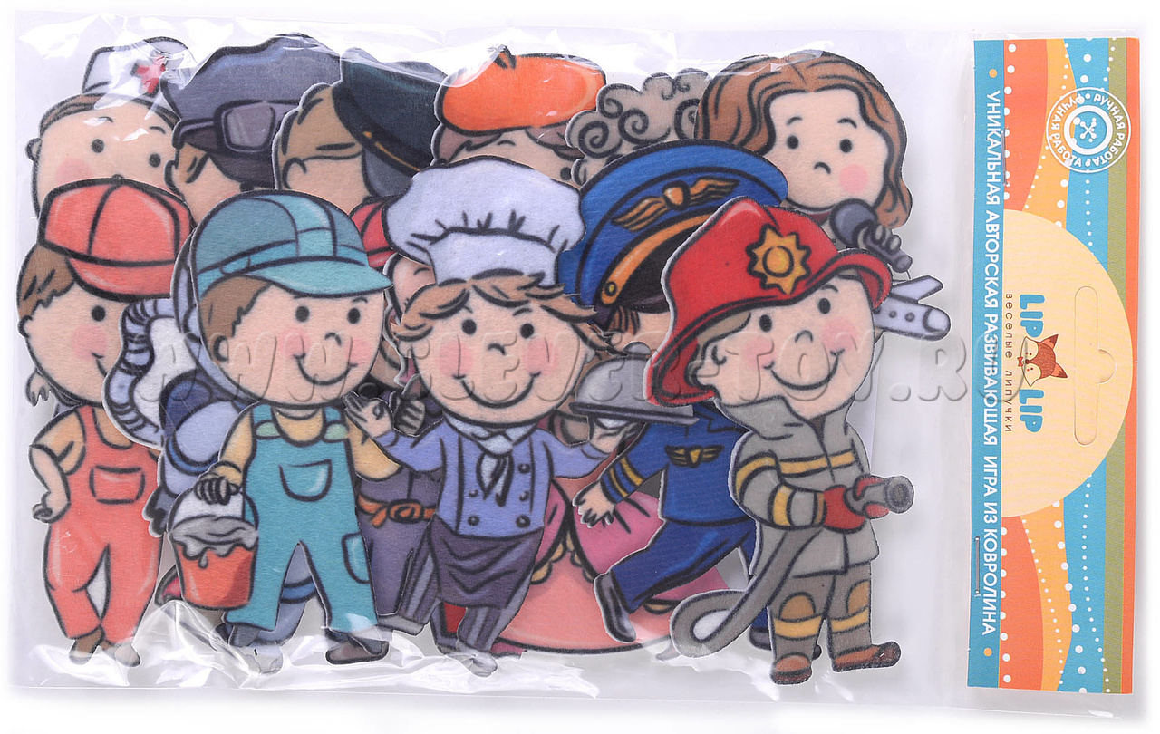 В комплект входит 14 карточек с изображениями представителей разных профессий. На обратной стороне каждой карточки есть липучка, благодаря которой её можно прикрепить к ковролиновой основе или фетру. Эта развивающая игра подходит для детей от года. Её можно использовать в детском саду, дома для индивидуальных занятий или вместе с логопедом.