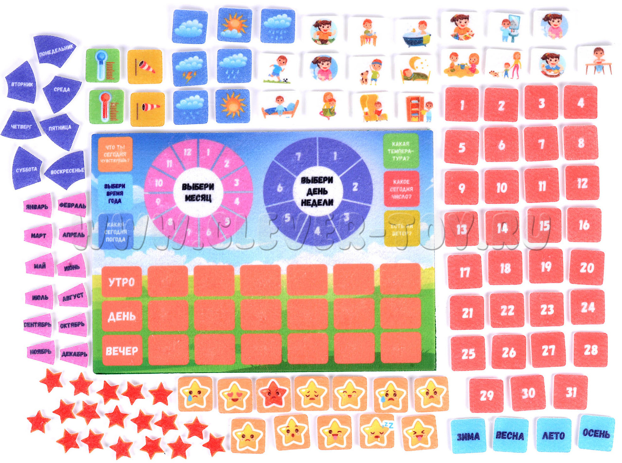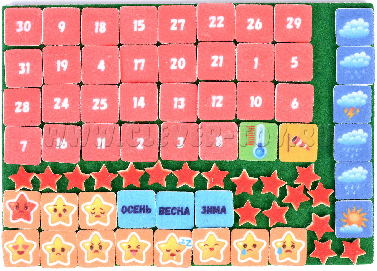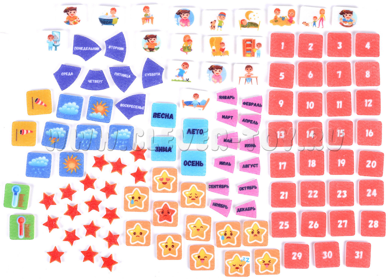 • Набор из 110 деталей (эмоции, осадки, ветер, температура, цифры, дни недели, месяцы, сезоны, распорядок дня, звездочки),