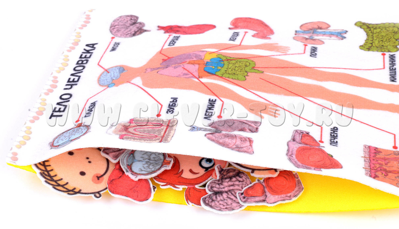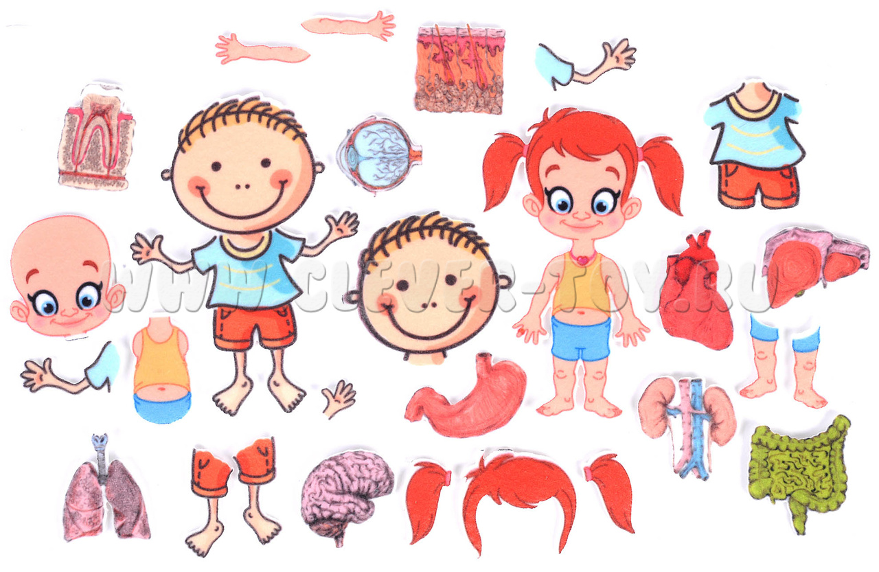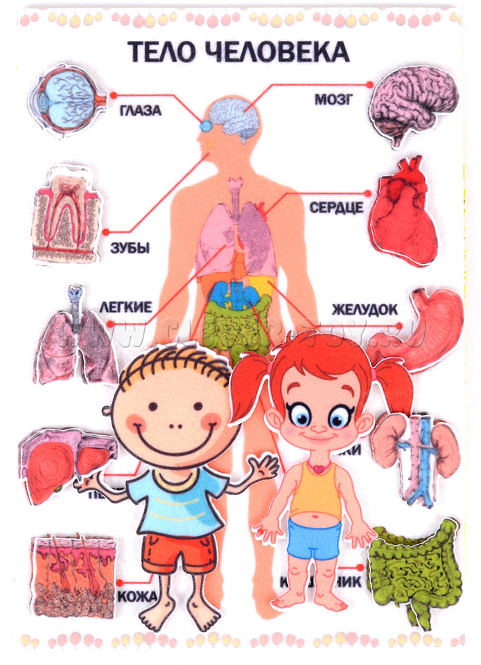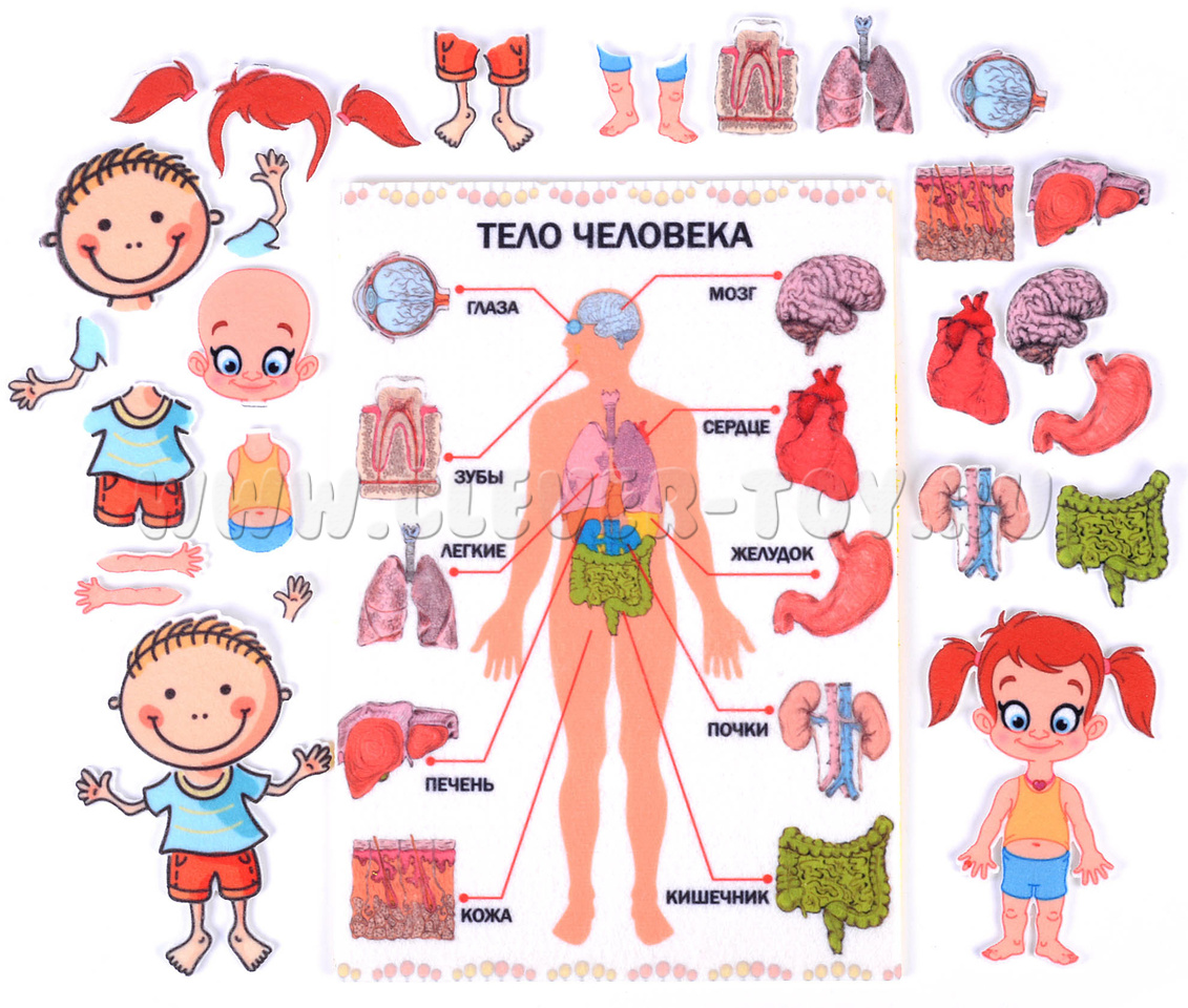 • игровое поле-плакат, где изображен человек и части его тела с подписями, на этом поле располагаются элементы – органы – на многоразовых липучках.