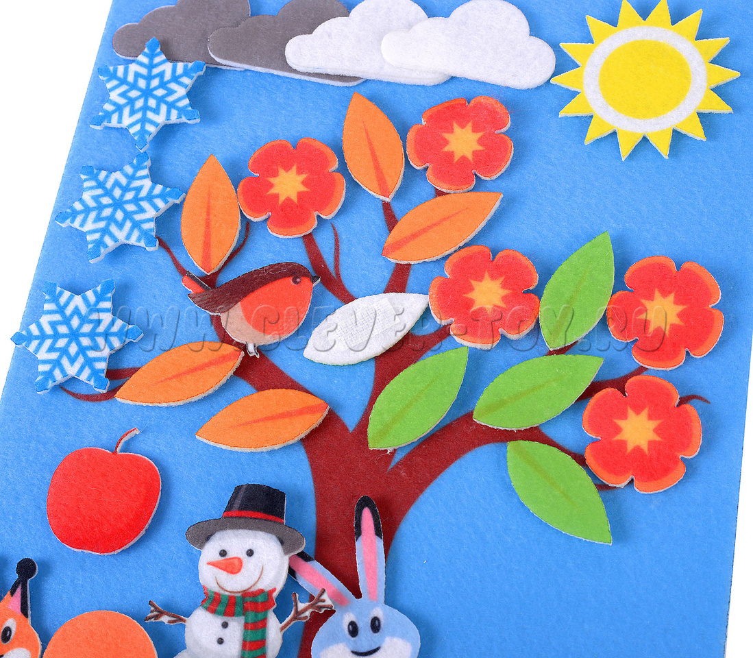 Все игровые элементы аппликации выполнены из современного материала – фетра. Он обладает рядом удивительных свойств: мягкий, яркий (окрашен безопасными красками), прочный и долговечный. Детали аккуратно вырезаны на специальном станке, легко крепятся на игровое поле с помощью липучек. На игровом поле сзади имеется специальный карман для хранения фигурок, чтобы они не терялись.