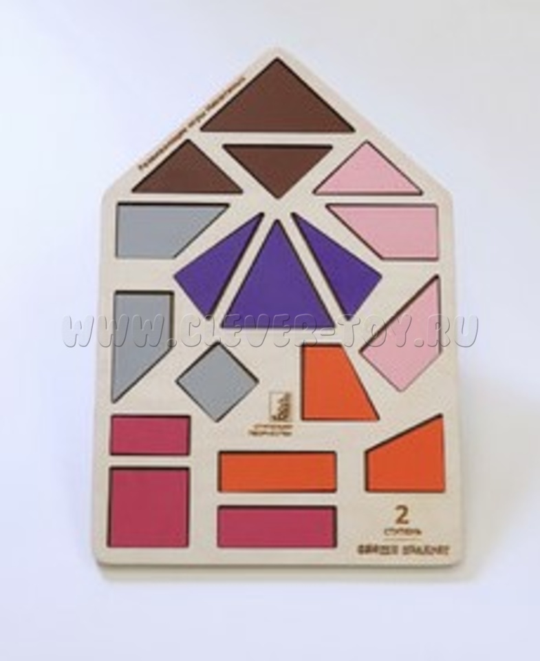 Деревянный планшет - "домик" - это методически правильная упаковка, где фрагменты квадратов хранятся в разобранном виде, что позволяет детям проявлять самостоятельность и творческое мышление.