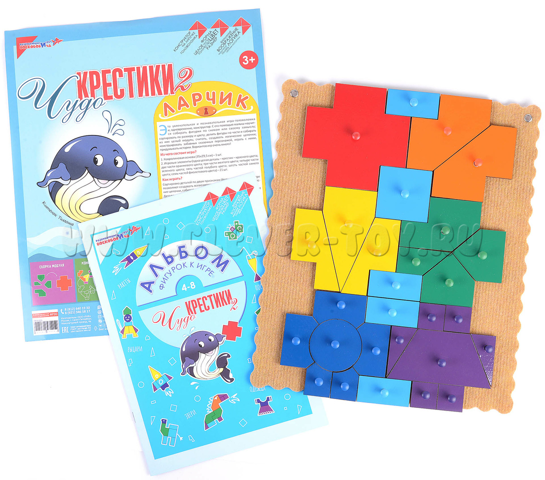 • 7 цветных Чудо-Крестиков: целый – красного цвета, из 2-х частей – оранжевый, из 3-х частей – жёлтый, из 4-х – зелёный, из 5-ти частей – голубой, из 6-ти частей – синий, из 7-ми частей – фиолетовый;
