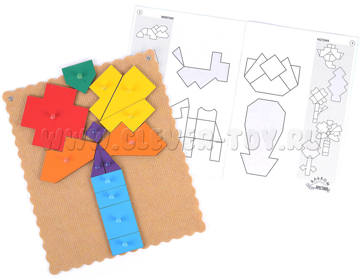 Крупные, яркие деревянные детали игрового пособия разделены на различные геометрические фигуры разной формы и величины, которые образуют 7 разноцветных крестиков. Из этих деталей ребёнок с помощью методических рекомендаций и подсказок взрослого может складывать фигуры: