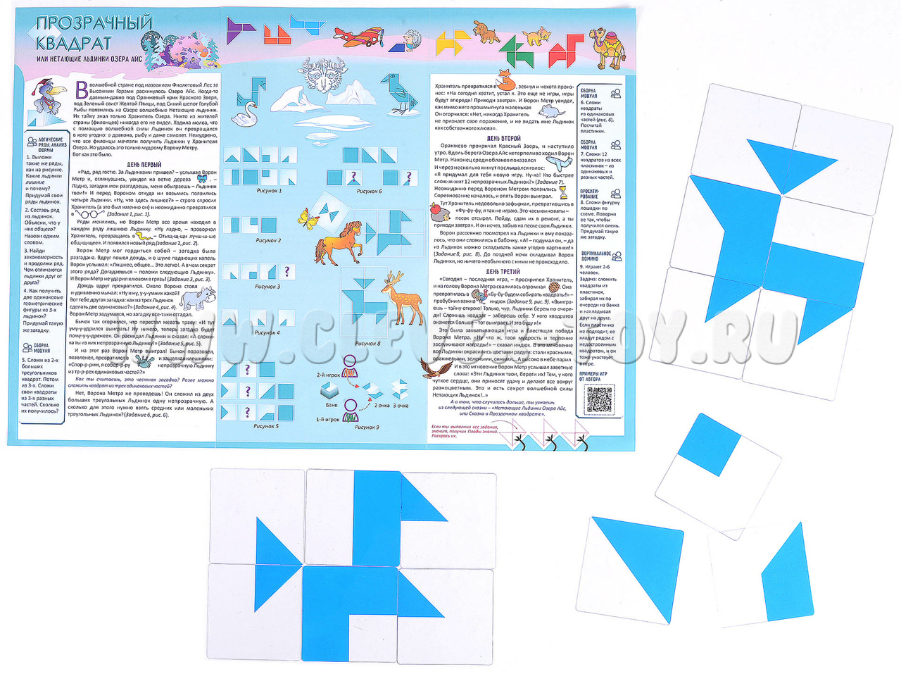 • 3 прозрачные пластинки, на каждой располагается 12 квадратов с разными выделенными цветом (синим) частями, всего 36 квадратов;