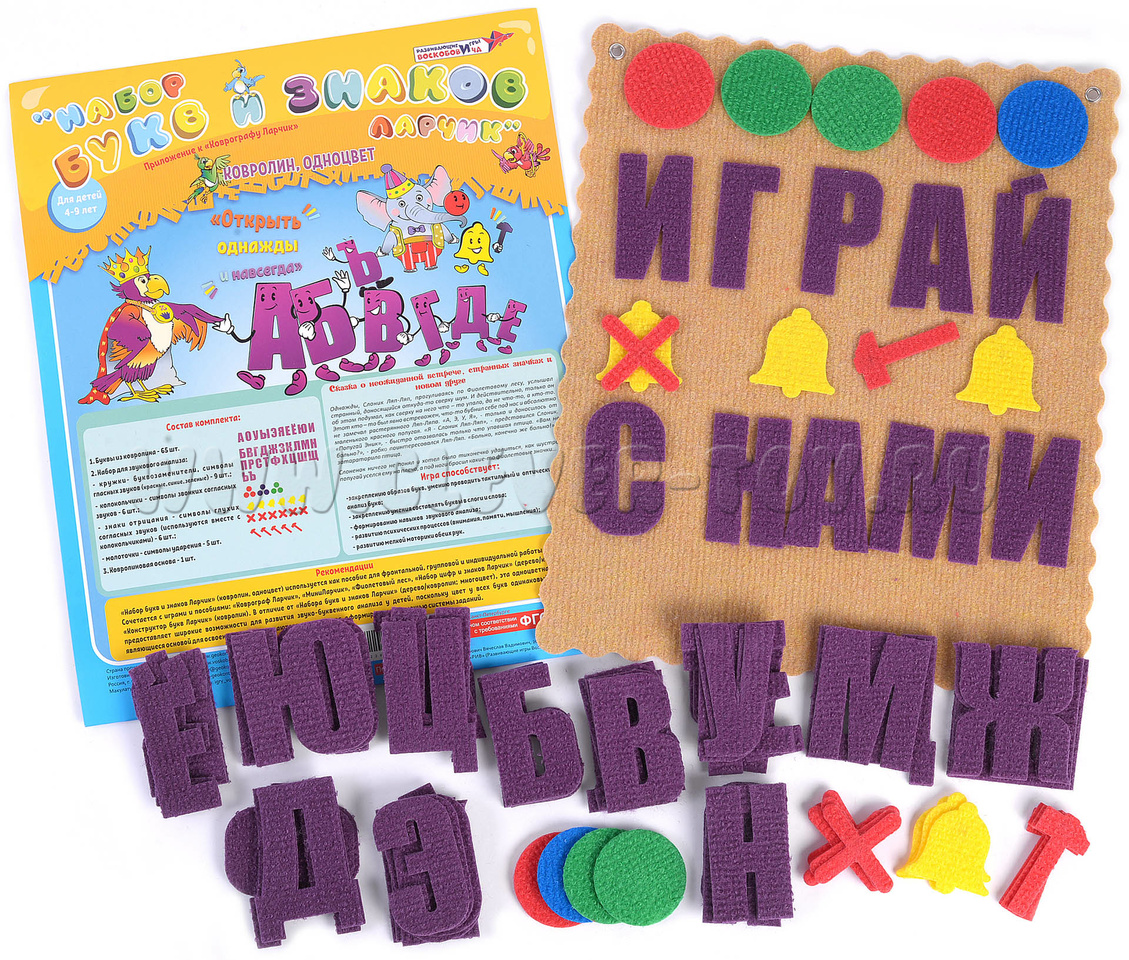 "Набор букв и знаков" используется как "пособие для групповой и индивидуальной работы с детьми в детских садах, развивающих центрах или в домашних условиях. Сочетается с играми и пособиями: "Коврограф Ларчик", "МиниЛарчик", "Фиолетовый лес", "Набор цифр и знаков Ларчик" (дерево/ковролин), "Конструктор букв Ларчик" (ковролин).