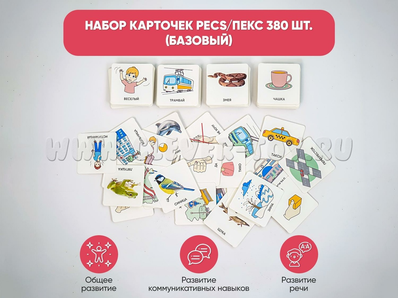 - Набор карточек индивидуально подбирается под каждого ребёнка, учитывая его особые потребности. С возрастом и развитием умений набор карточек может расширяться. Для некоторых людей карточки PECS /ПЕКС могут быть средством общения на протяжении всей жизни.