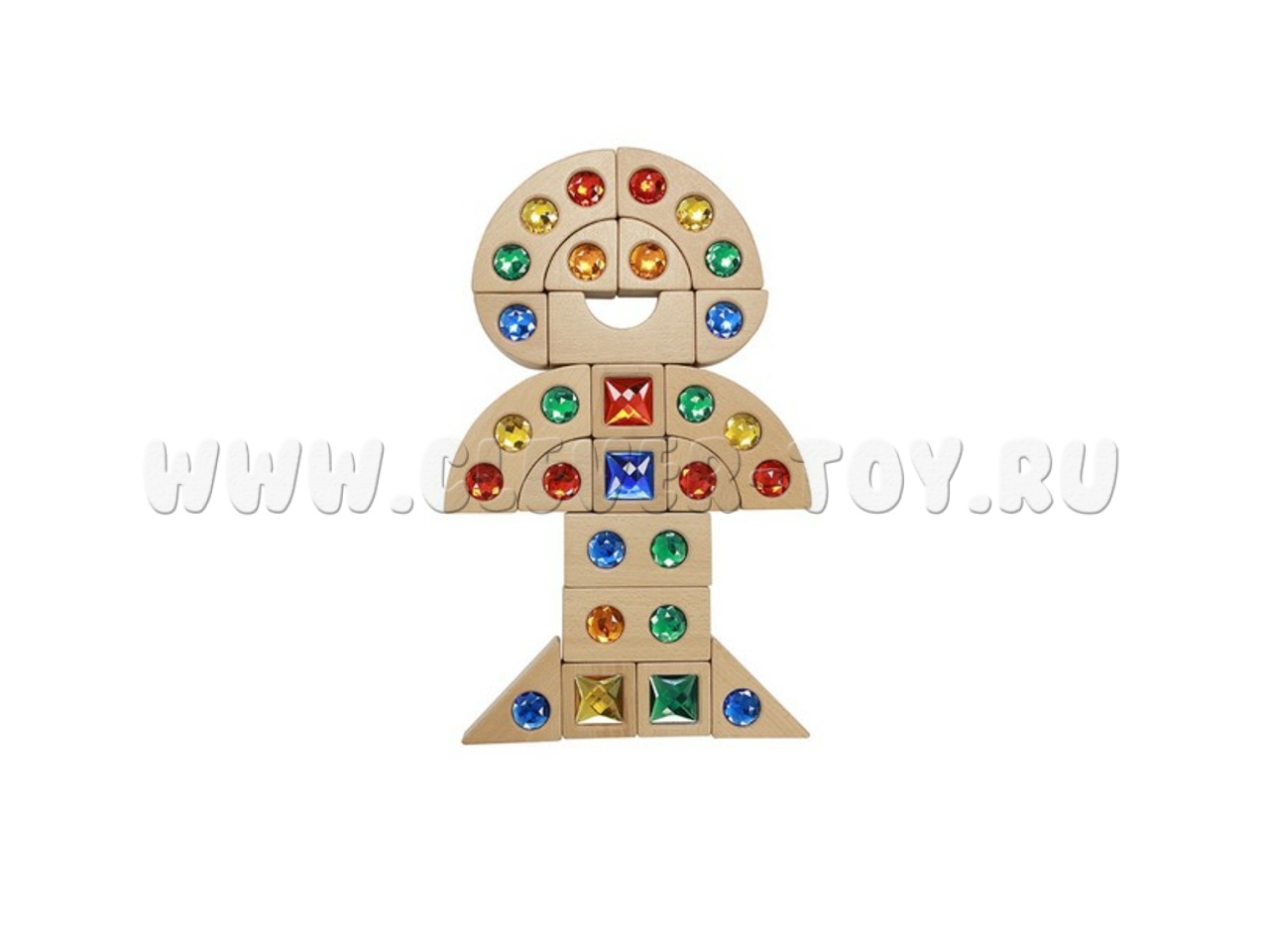 Игра "Набор сокровищ" включает 40 деревянных блоков из бука с яркими акриловыми вставками, похожими на драгоценные камни.