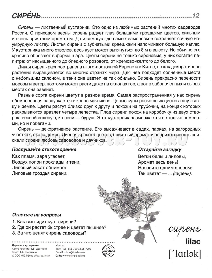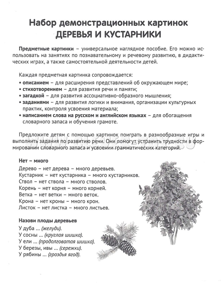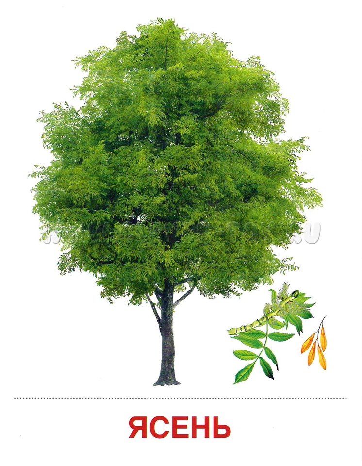 Состав комплекта (16 карточек): Берёза, Бузина, Вяз, Дуб, Ель, Ива плакучая, Каштан конский, Клён, Липа, Ольха, Осина, Сирень, Сосна, Тополь, Черёмуха, Ясень.