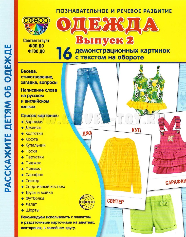 Набор карточек "Одежда. Выпуск 2" состоит из 16 цветных демонстративных карточек (картинок) и адресован детям, желающим познакомиться с видами одежды.