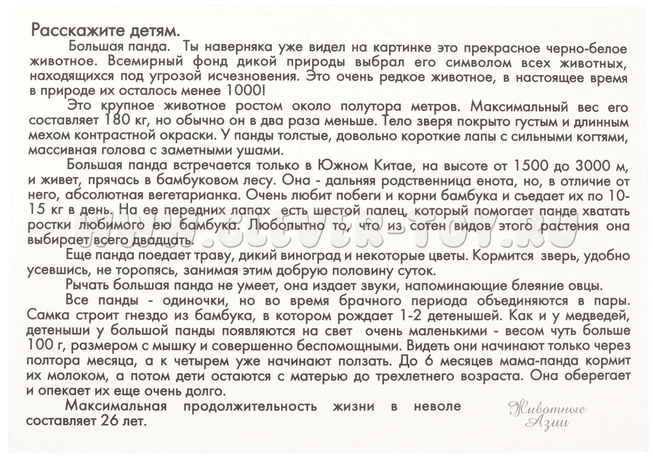 На одной стороне карточки расположена яркая картинка с изображением животного Азии (изображение детальное и реалистичное), на обратной стороне – доступная для ребёнка информация о животных (описывает внешний вид животного, ареал обитания, особенности питания и строения, интересные факты о происхождении животных Азии).