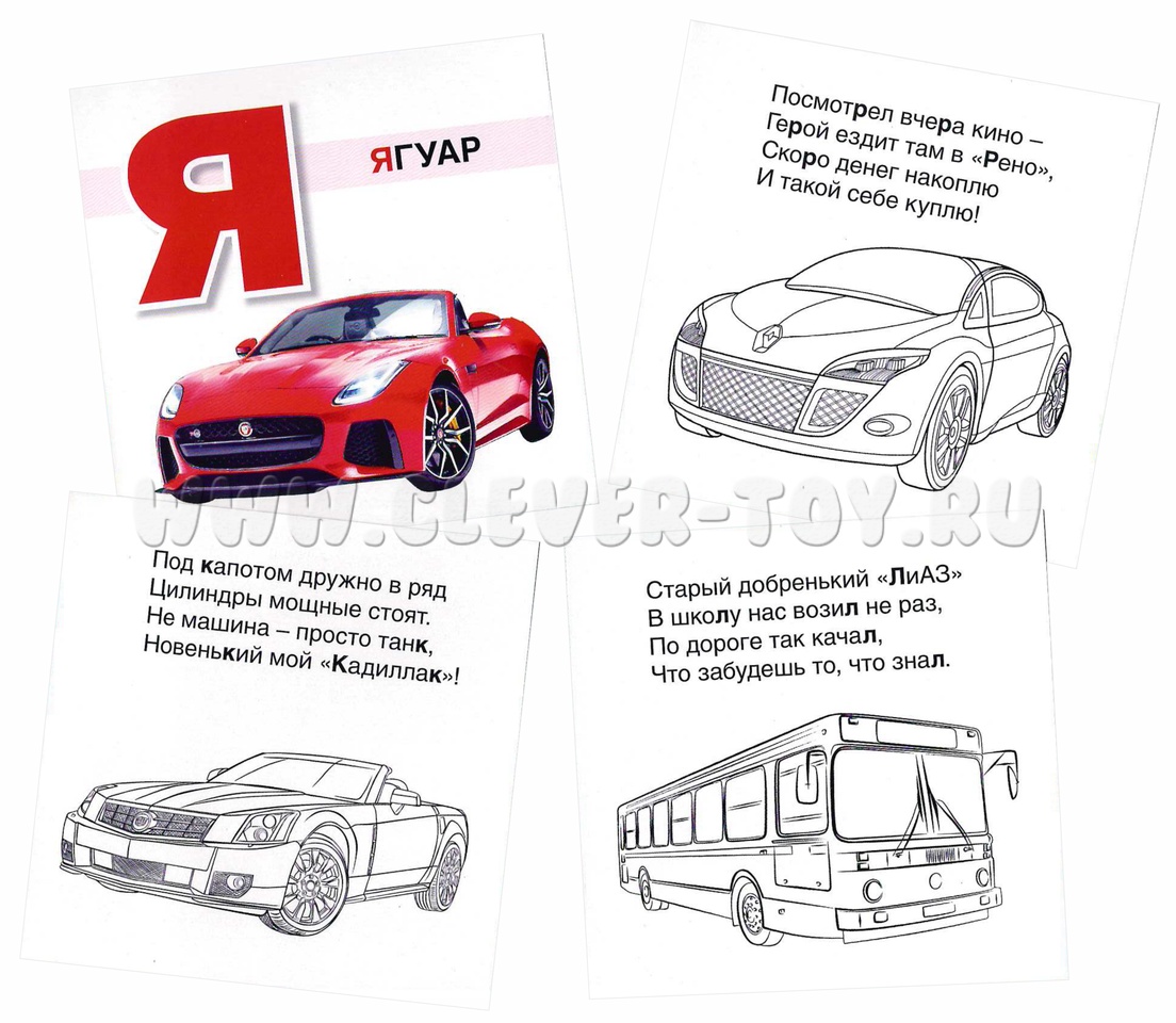 На цветной стороне карточек приводится автомобиль определенной марки соответствующей букве алфавита: А - Ауди, Б - БМВ, В - Вольво и так далее. Гласная изображена в красном цвете, согласная - в синем. Серым цветом выделены буквы Ь и Ъ, не имеющие звуков, но необходимые для обозначения твёрдости и мягкости.