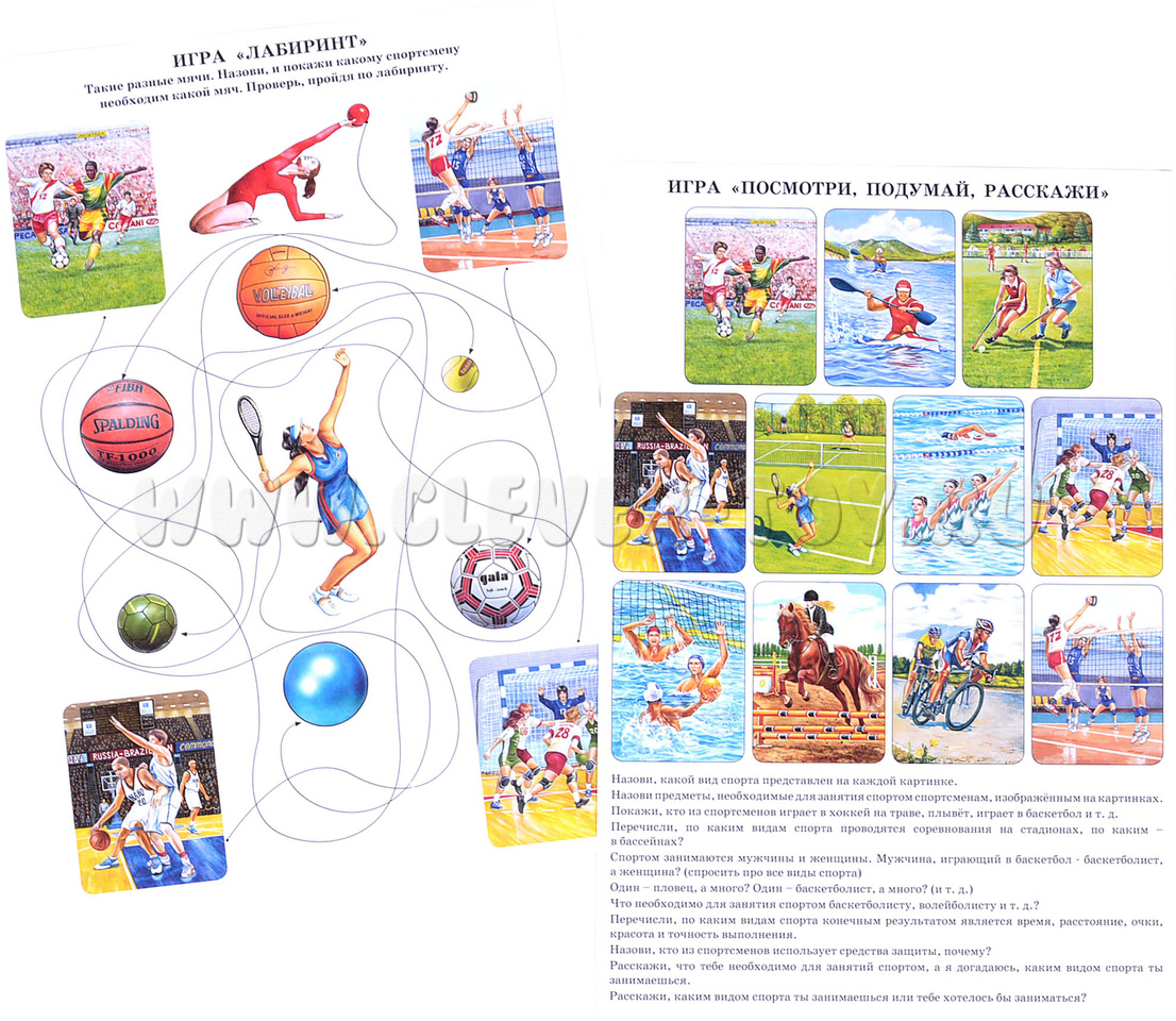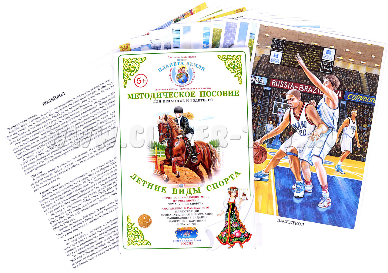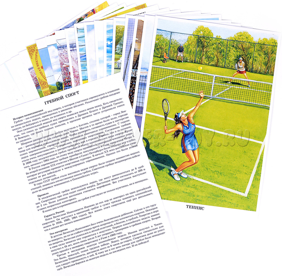 • 11 картинок А4, иллюстрирующих разные виды спорта, на обратной стороне листа - краткая справка, включающая в себя сведения об истории возникновения, правилах, достижениях, интересных фактах;