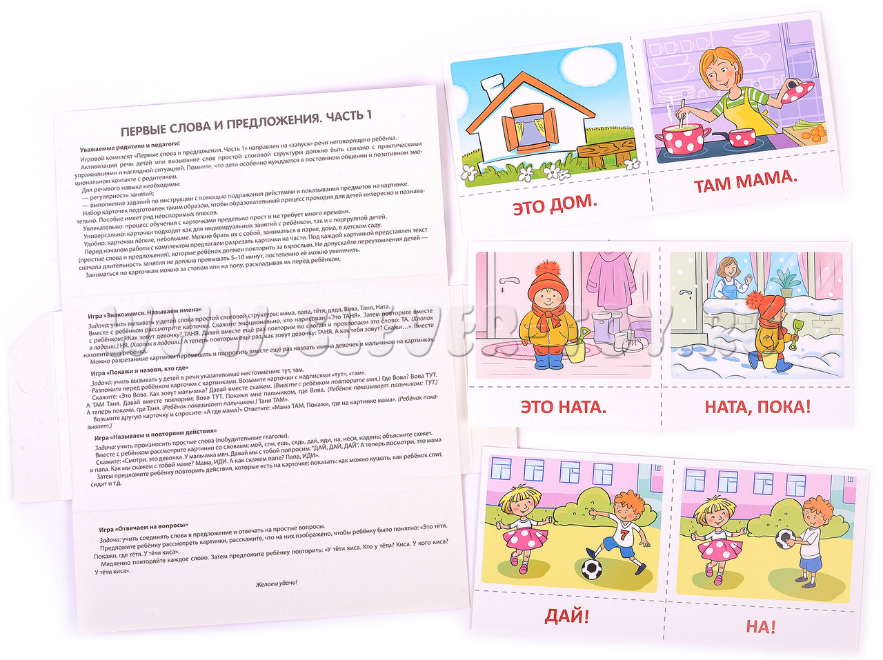Игровой комплект "Первые слова и предложения. Часть 1" это эффективное пособие для развития речи у детей. Набор разработан специально для того, чтобы помочь неговорящему ребёнку начать говорить.