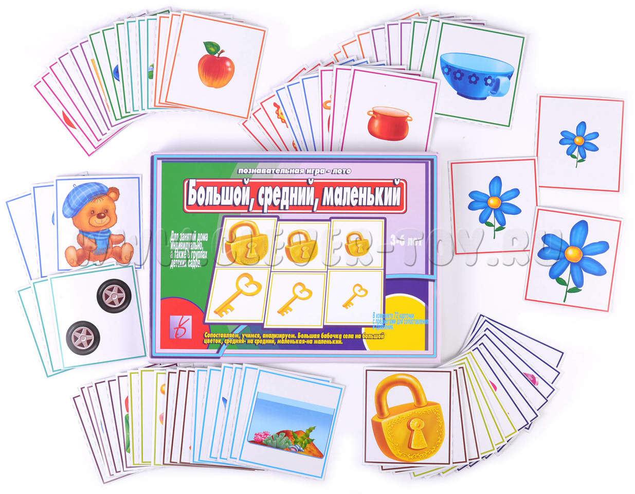 Познавательная игра-лото для детей 3-6 лет, которая познакомит малышей с величиной предметов, а также позволит повторить цвета. Для занятий в группах детского сада и домашнего обучения.