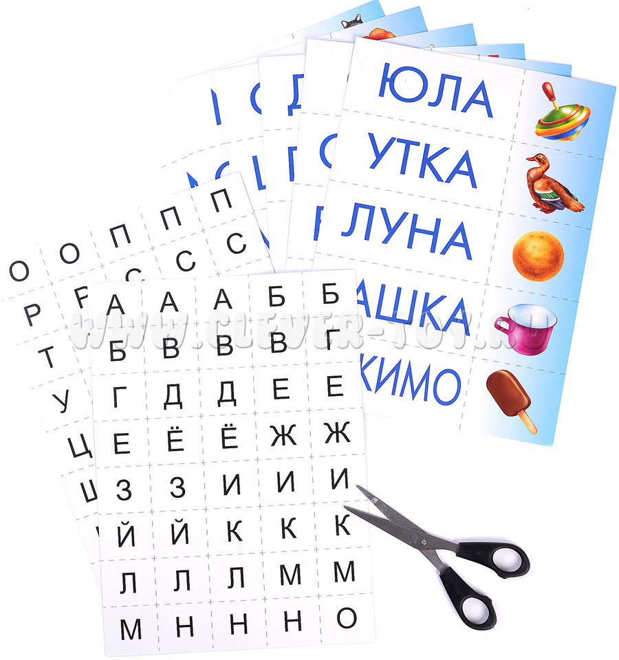 Количество: 6 листов с картинками и словами (по 5 на каждом, всего 30 картинок и 30 слов) и 2 листа с буквами (всего 80 карточек с буквами)