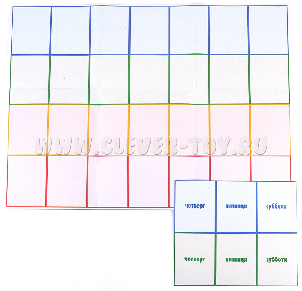 Развивающая игра-лото, которая поможет детям дошкольного возраста выучить дни недели, их последовательность. Перед началом игры требуется разрезать карты с названиями дней недели по пунктирным линиям на квадраты.