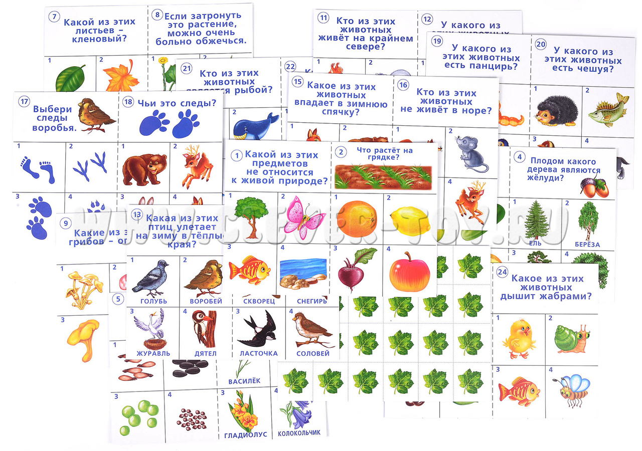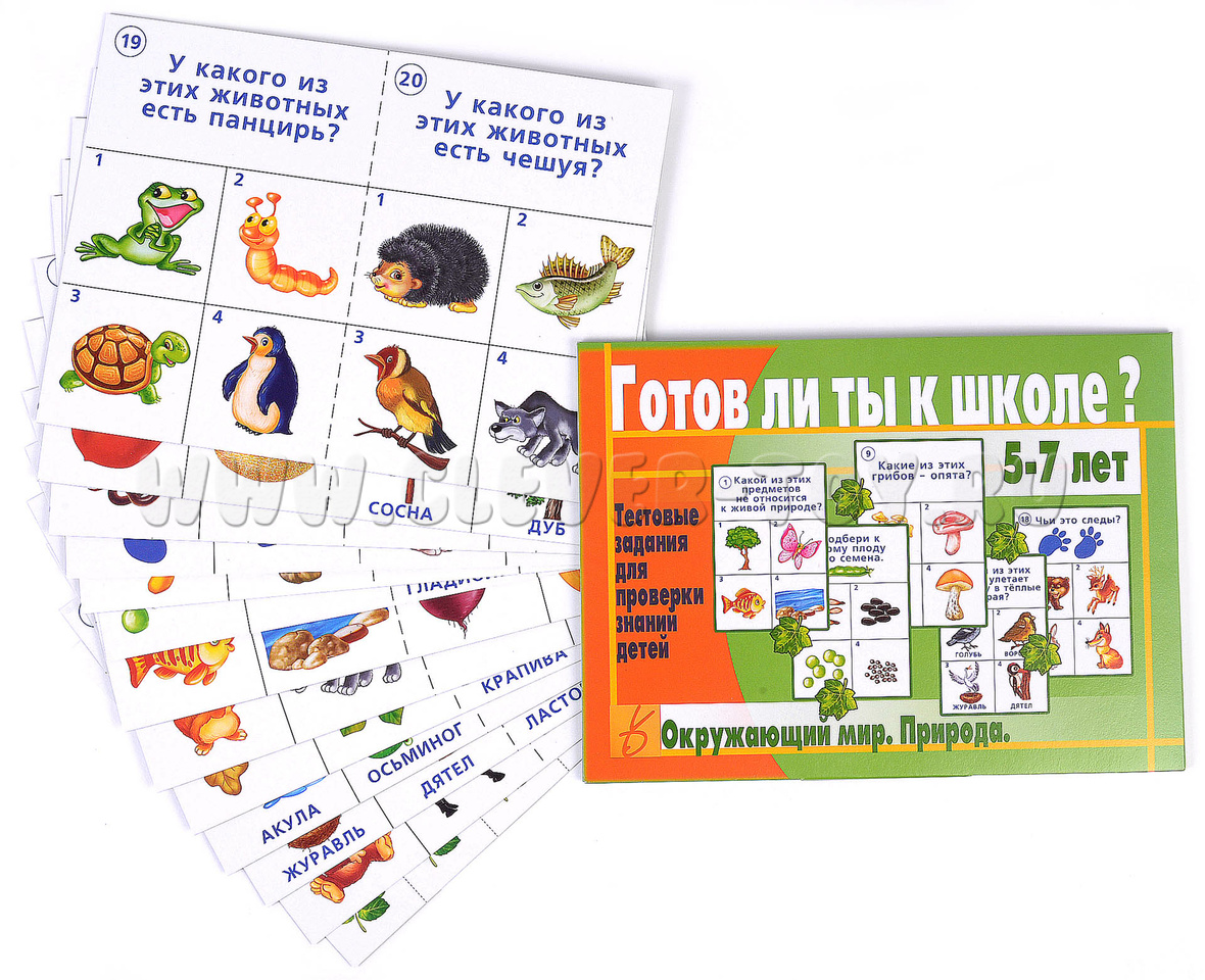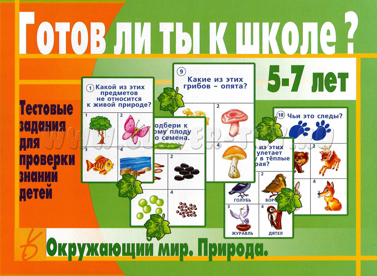 Тестовые задания для проверки знаний детей "Готов ли ты к школе? Окружающий мир. Природа" представляет собой удобный и информативный инструмент для проверки знаний будущих дошкольников. Карты формата А4, выполненные из качественного картона, содержат в себе иллюстрированные тестовые задания с 4 вариантами ответов в каждом. На одном листе помещается 2 карточки с заданиями – это особенно удобно для организации групповых занятий или домашнего задания.