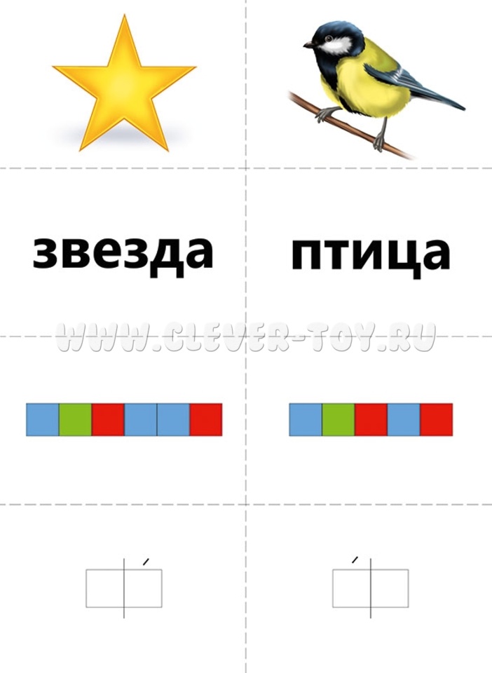 - Это игра для индивидуальных и/или групповых занятий. Цель игры: подобрать слово и две схемы (звуковую и слоговую) к каждой из картинок. Если участвует группа детей, карточки с картинками (картинки можно заменить на слова) раздаются игрокам поровну, а ведущий начинает показывать поочередно карточки со словами (картинками) и схемами. Подходящие карточки участники забирают себе, побеждает тот, кто быстрее и правильнее всех соберет свои карточки;