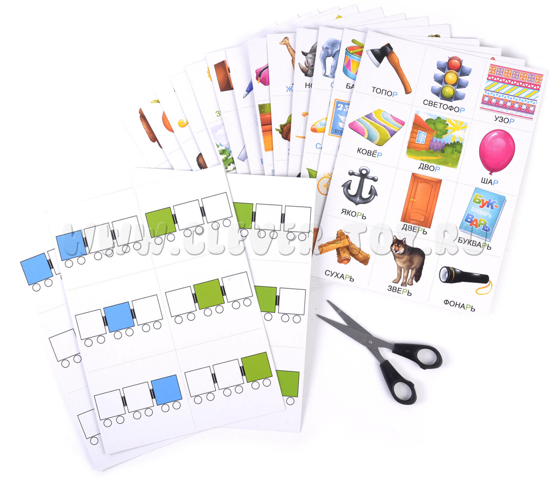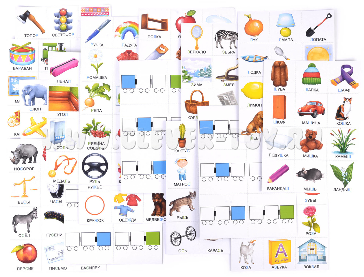 1. Раздайте детям карточки с частями слов. Предложите найти картинки, названия которых начинается одинаково. Выигрывает тот, кто быстрее других соберет свои карточки и правильно объяснит свой выбор.
