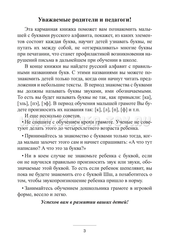 При занятиях по пособию: объясните ребёнку, из каких элементов состоит каждая буква, чтобы избежать путаницы и зеркального отображения букв. Это поможет предотвратить проблемы с письмом в будущем при обучении в школе. В конце книжки вы найдёте русский алфавит с правильными названиями букв. Знакомьте детей с названиями букв только тогда, когда они начнут читать предложения и небольшие тексты. Во время знакомства с буквами называйте их звуками, которые они обозначают. Начинайте знакомство с буквами только тогда, когда ребёнок сам проявит интерес и начнёт задавать вопросы. Обучайте дошкольника грамоте в игровой форме, весело и легко