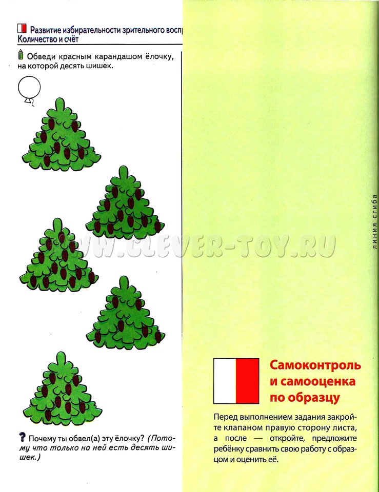 В тетради есть специальный клапан для самоконтроля и самооценки по образцу. Перед выполнением задания закройте клапаном правую сторону листа, на котором в левом верхнем углу нарисован соответствующий значок. После выполнения ребёнком задания откройте правую сторону в тетради, предложите ему сравнить свою правильно, красный - есть ошибки, надо попробовать ещё раз.