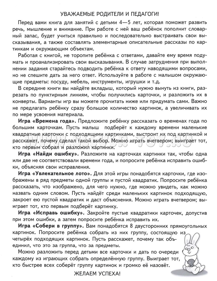 Книга по речевому развитию детей 4-5 лет поможет развить речь, мышление и внимание. При работе с ней ваш ребёнок пополнит словарный запас, будет учиться правильно и последовательно выстраивать свои высказывания, а также составлять элементарные описательные рассказы по картинкам и окружающим объектам.