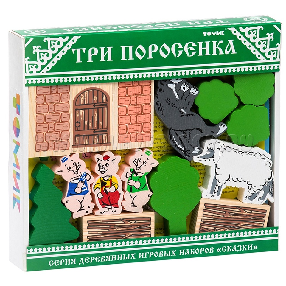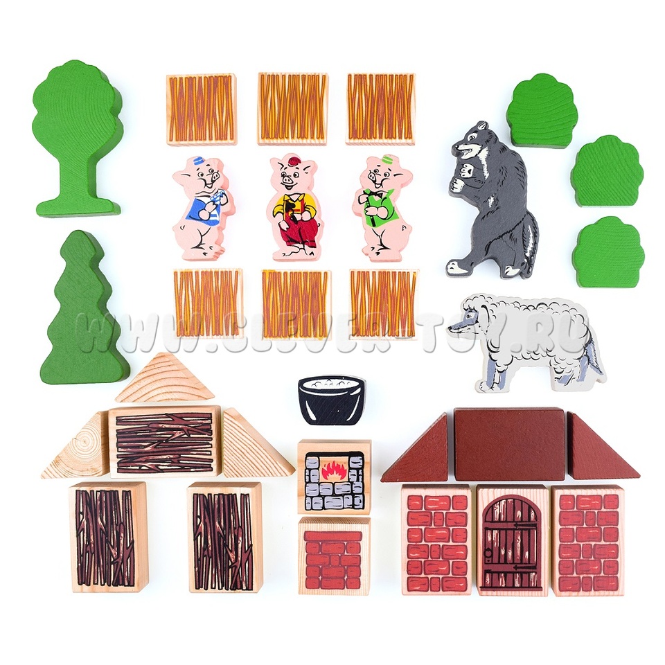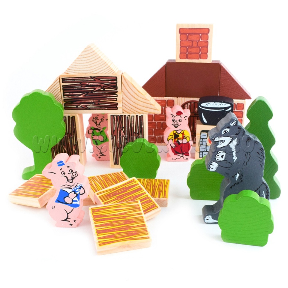 В набор входят деревянные модели персонажей и декорации сказки "Три поросенка" (всего 31 деталь), а также вкладыш с текстом сказки.
