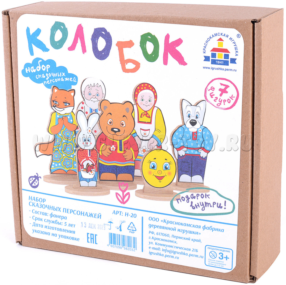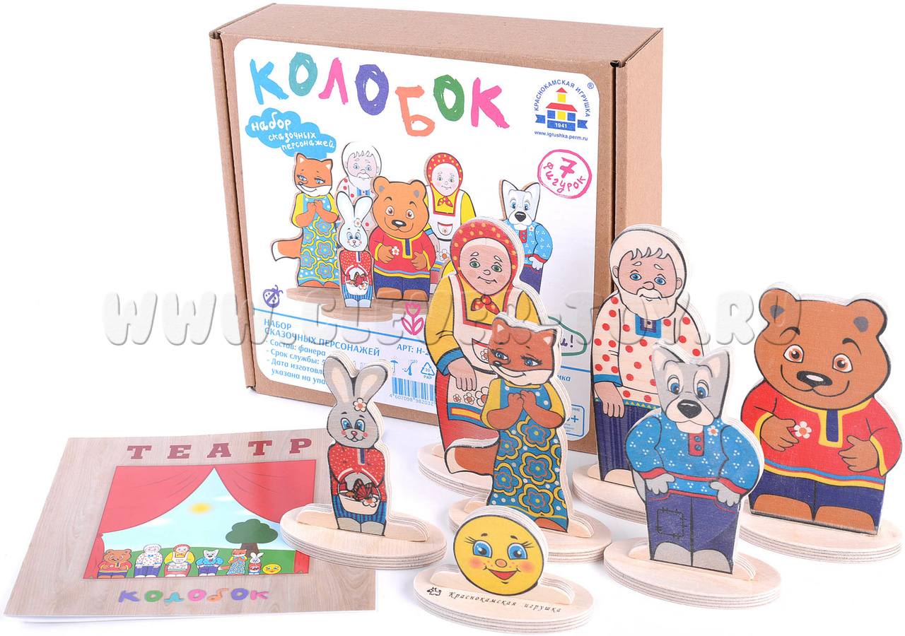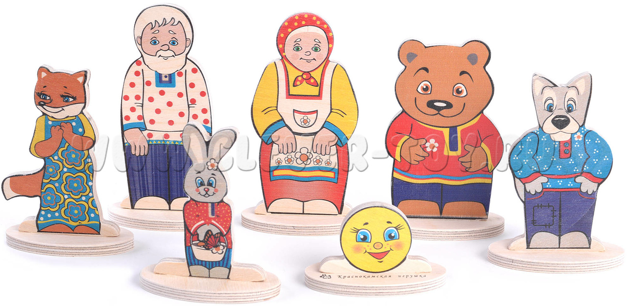 • 7 деревянных фигурок на подставках (Колобок, Дед, Бабка, заяц, медведь, волк, лиса) размером от 4 до 12 см.