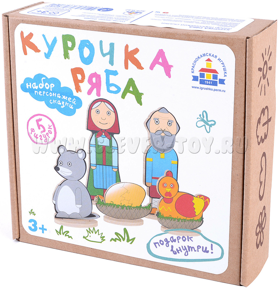 • 5 сказочных персонажей на подставках(Дед, Бабка, Курочка, Мышка, Яйцо) от 5 до11,5 см.;