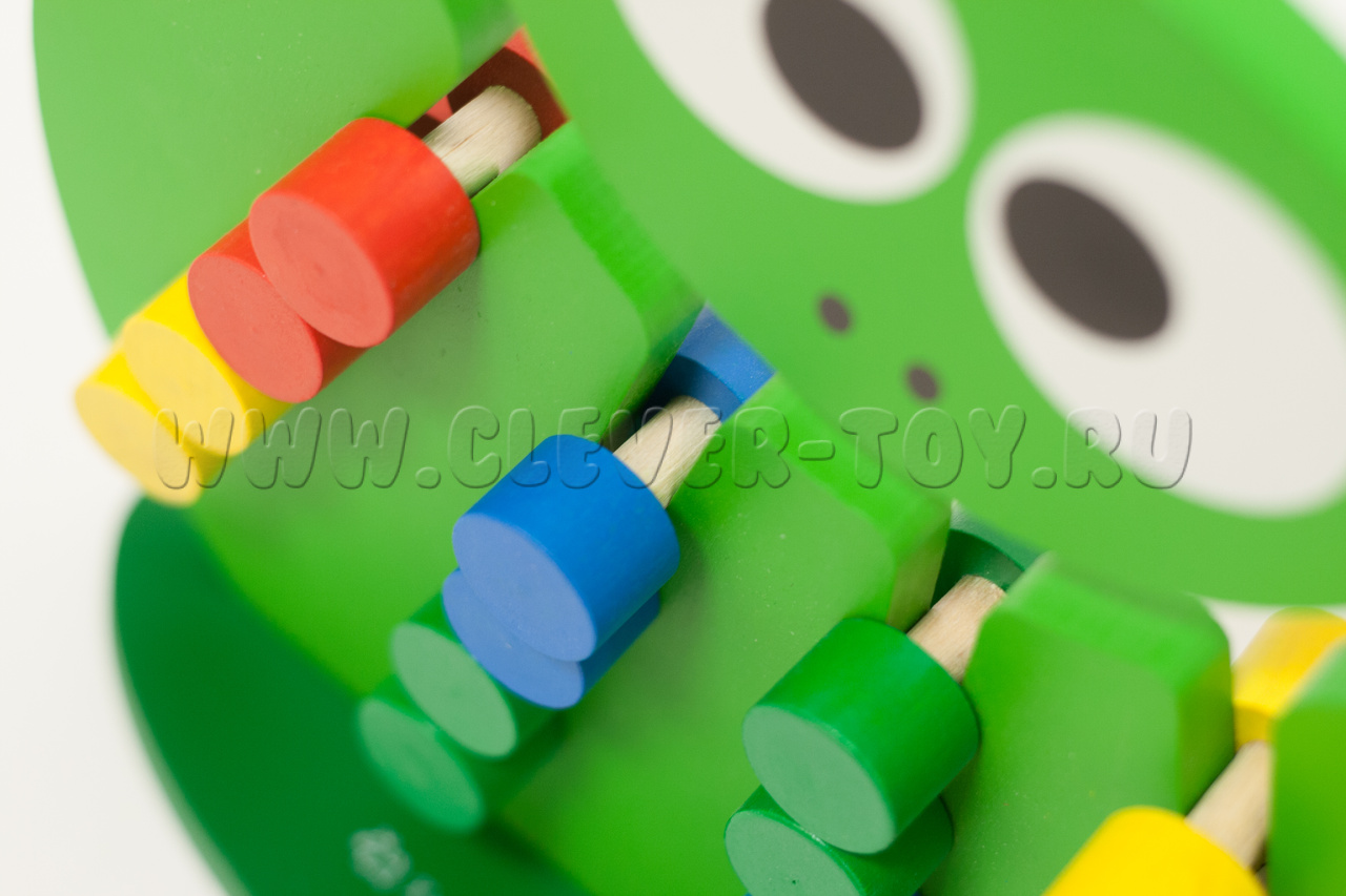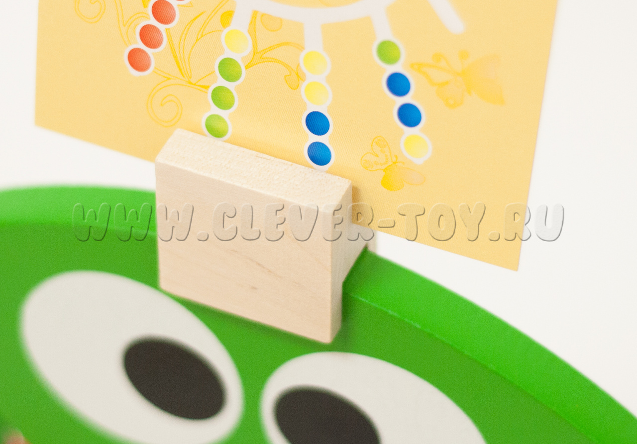 • игровое поле – лягушка из дерева с канавками с разноцветными деревянными ползунками (фишками) жёлтого, зелёного, красного и синего цвета;
